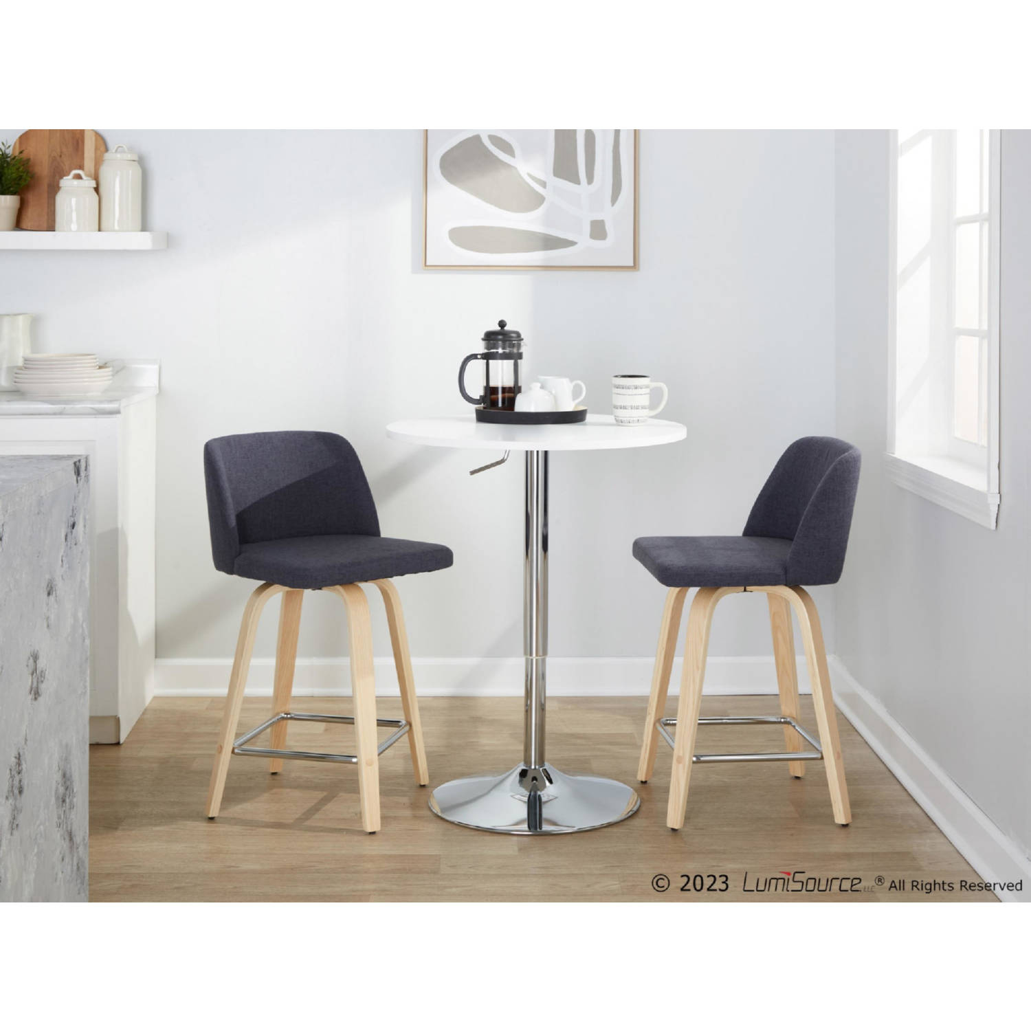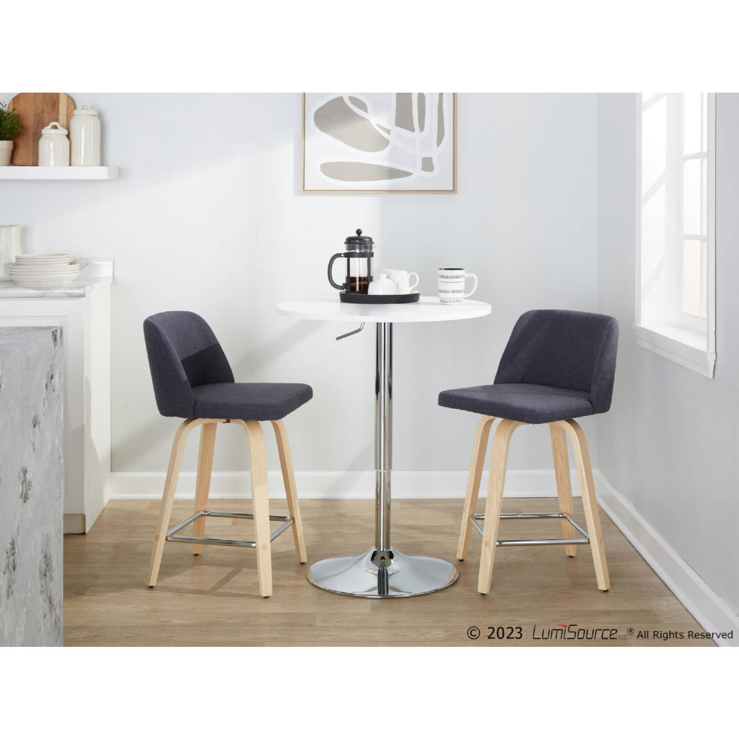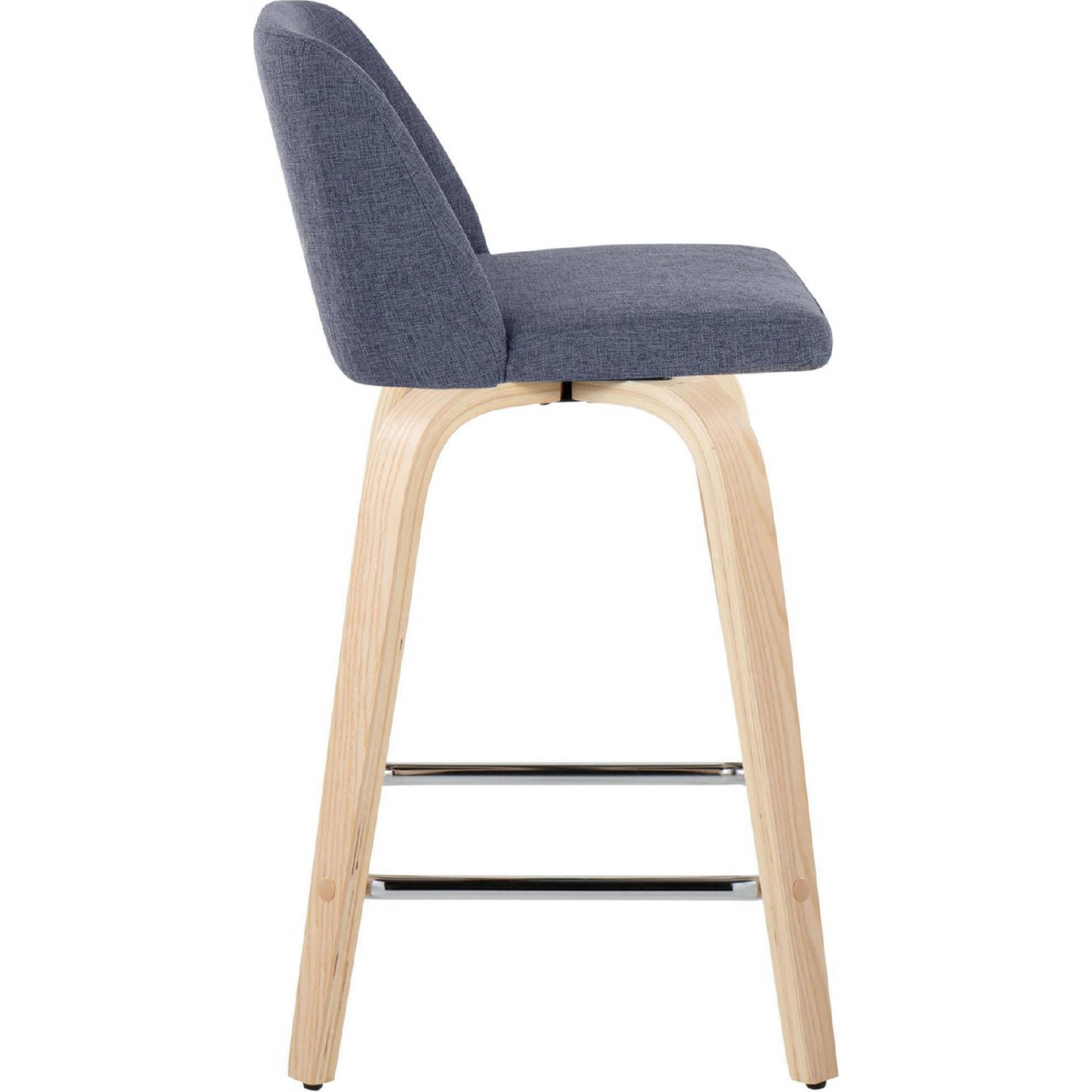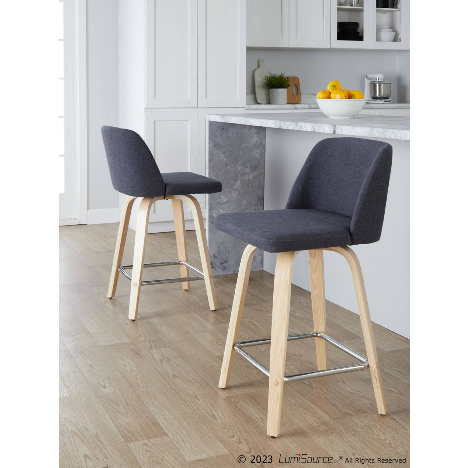 Lumisource Toriano 24" Swivel Counter Stool in Natural Wood & Blue Fabric with Chrome Footrest (Set of 2)