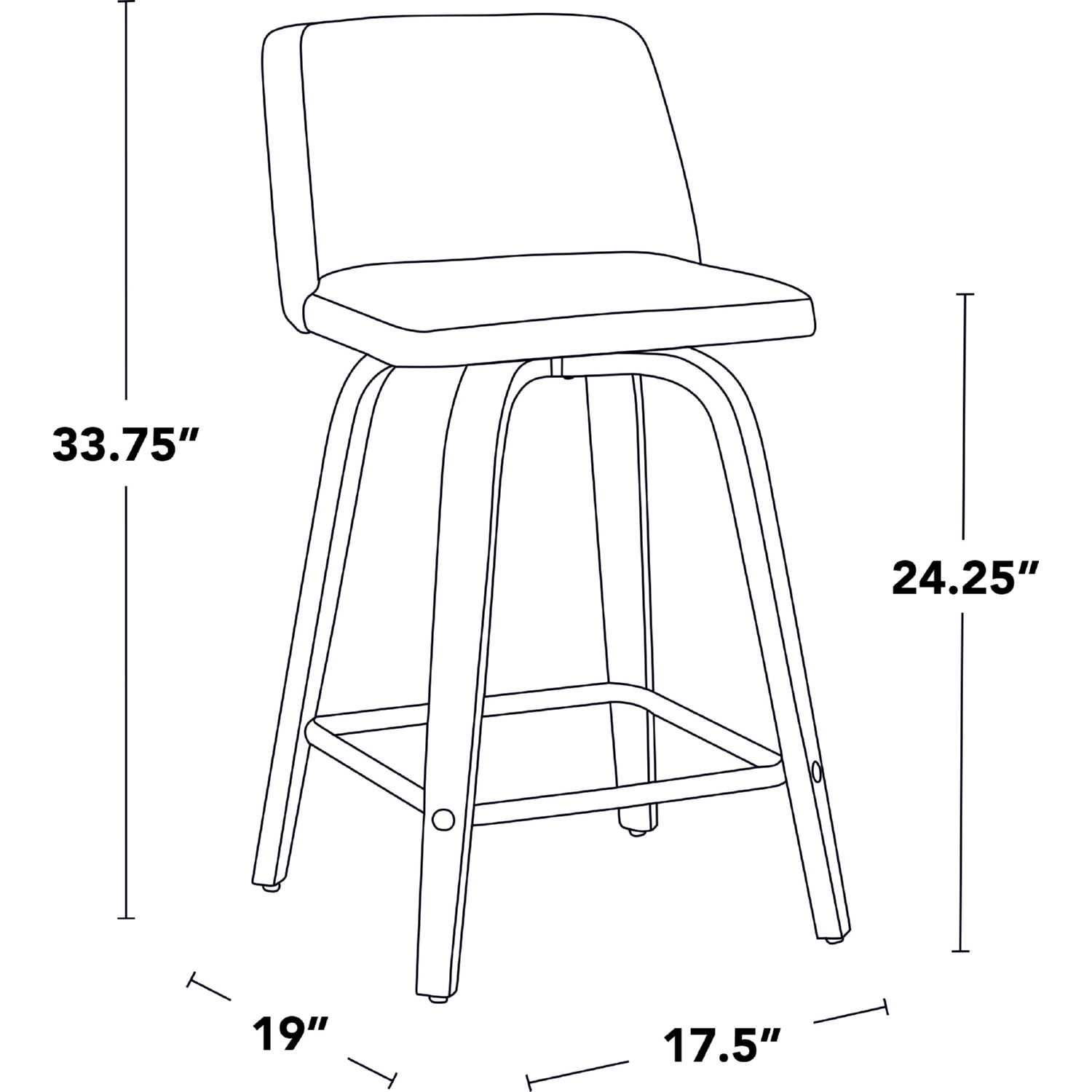 Dimensions: 19"D x 17.5"W x 33.75"H, Seat To Floor: 24.25", Seat Depth: 16", Inside Seat Width: 17.5", Seat To Footrest: 17.75", Backrest Height: 10.5", Seat To Back Angle: 102 degrees