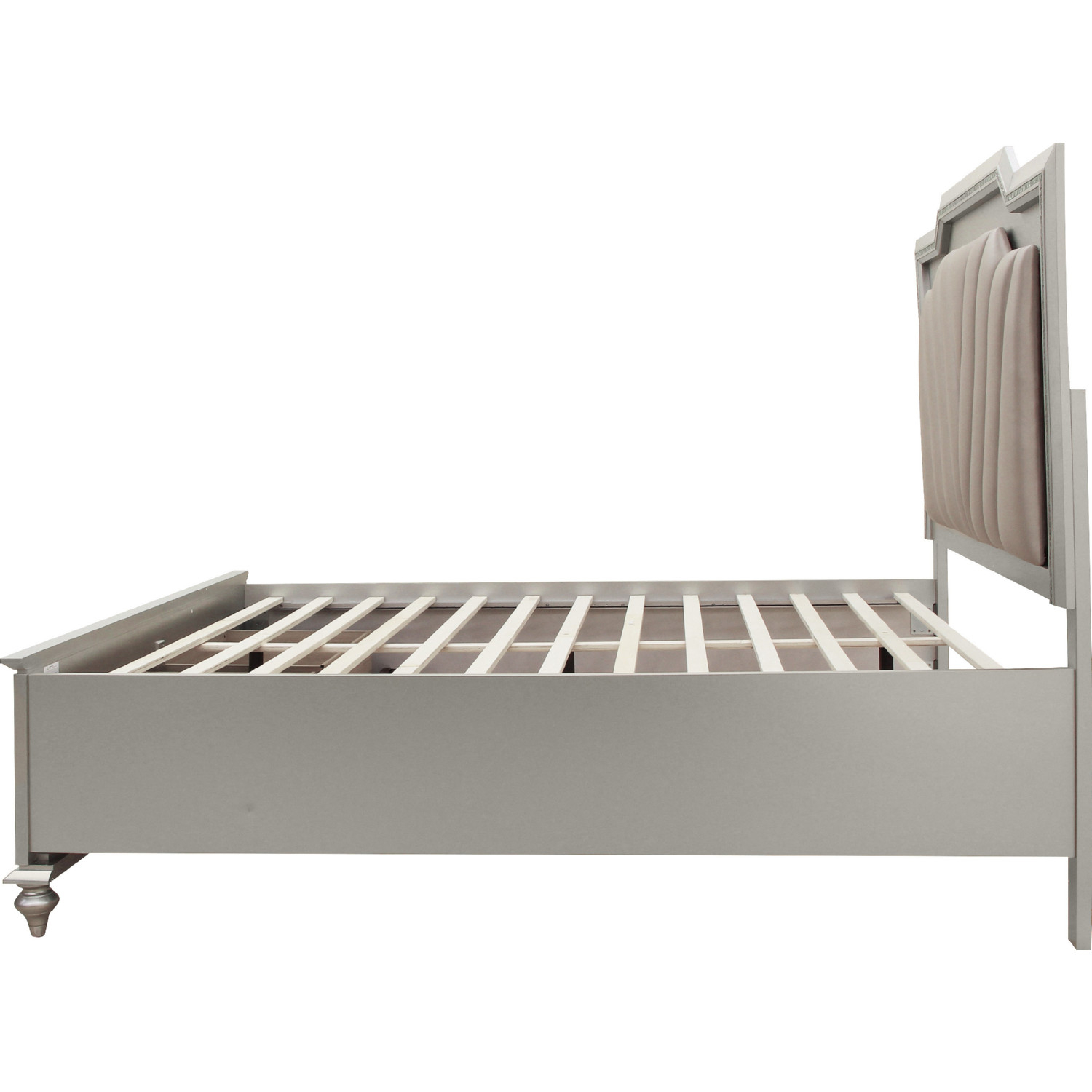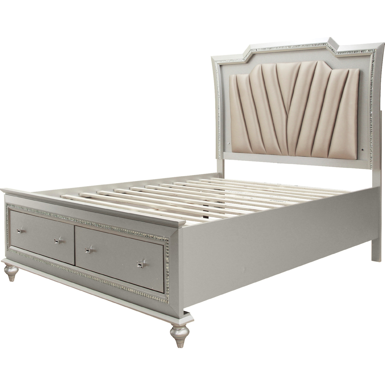 The Kaitlyn bed provides a commanding presence in any room. This contemporary storage bed in champagne finish features a fabric padded rectangular headboard and a low-profile footboard with storage drawers. Crafted with a transitional look that is an ideal addition to any bedroom, the headboard is accented with LED lights and a crystal-like sparkling trim.
