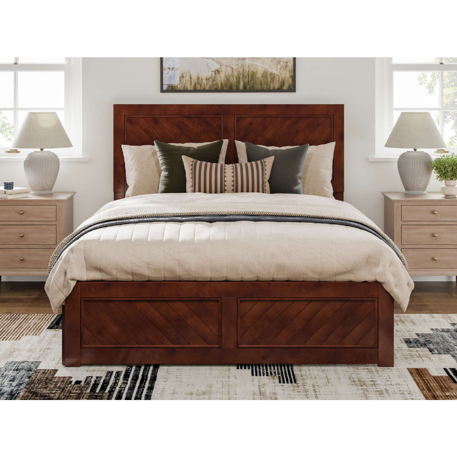 • Stunning matching headboard and footboard with captivating chevron carvings add a touch of sophistication