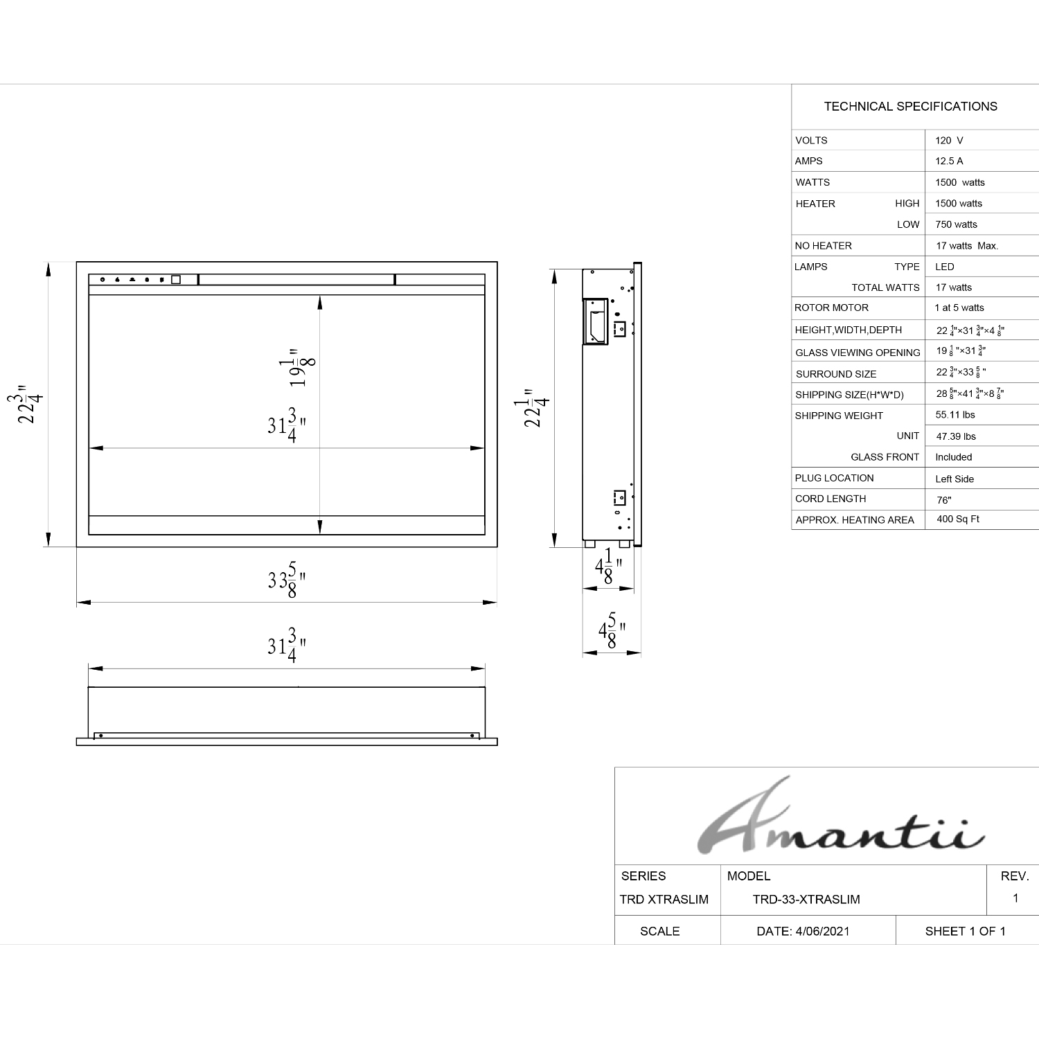 Dimensions: 31.75"W x 4.125"D x 22.25"H, Glass Viewing Opening: 31.75"W x 19.125H, Surround Size: 33.625"W x 22.75"H