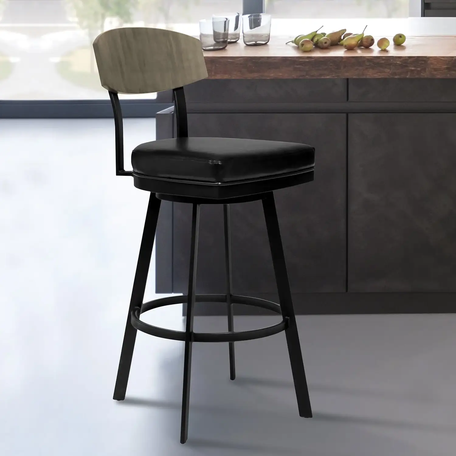 The Armen Living Frisco mid-century armless bar stool is a terrific choice for any modern household. The elegant Frisco features a durable Matte Black finish metal frame and plush Black Leatherette upholstered seat. This combination assures durability without compromising on the Frisco's unique contemporary aesthetic. The Frisco's back features a Grey Walnut wood panel that offers excellent back support while the 360 degree swivel seat allows for excellent user mobility while seated. The sleek straight leg design of the Frisco is balanced by the inclusion of a round footrest for added support. The Frisco's legs are tipped with floor protectors, assuring that the bar stool will not slip on or scratch hardwood floors when moved. The beautiful Frisco bar stool is available in two sizes: 26" counter height and 30" bar height.