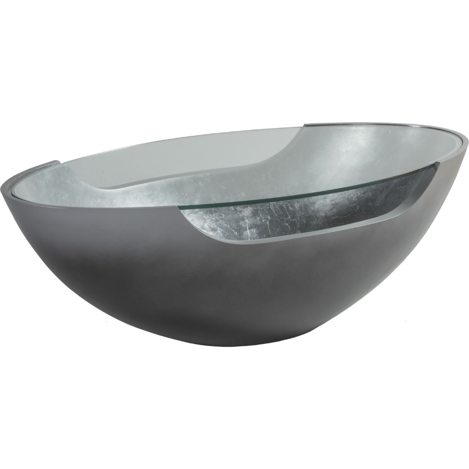 Modern, organic casted design with a smooth a exterior in a silver gray with ombre effect, contrasted against an interior in silver leaf, with inset tempered glass top and an oval bowl-effect bottom.