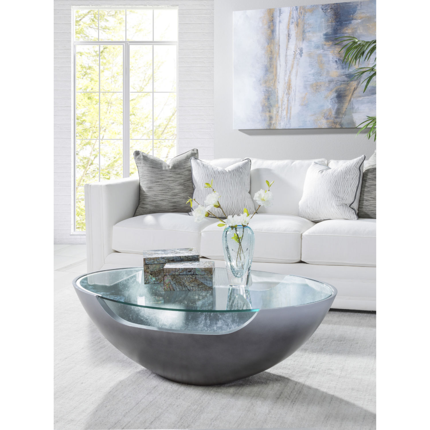 • Oval bowl-effect table with smooth a exterior in an silver gray with ombre effect, contrasted against an interior in silver leaf, with inset tempered glass top. Glass top 46.75"W x 24.75"D x .375" thick.