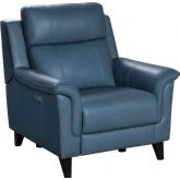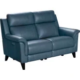 Mid-century modern elevated reclining sofa with power recline and power headrests. This sofa features box seat style pad over chaise seating with pocketed coil springs, tucked pillow arms, and clean line pub backs. Power buttons have USB ports to keep your devices charged. Matching loveseat and recliner available. Legs are finished in a dark teak color.