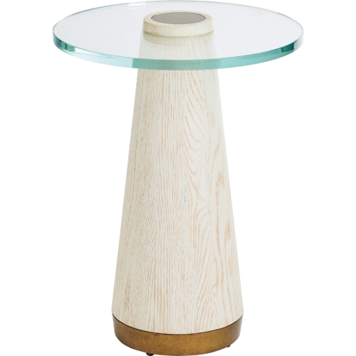 The 18" diameter Castlewood accent table features a tapered wooden base, a .75" ultra-clear glass top and a decorative metal cap in Calais brass.