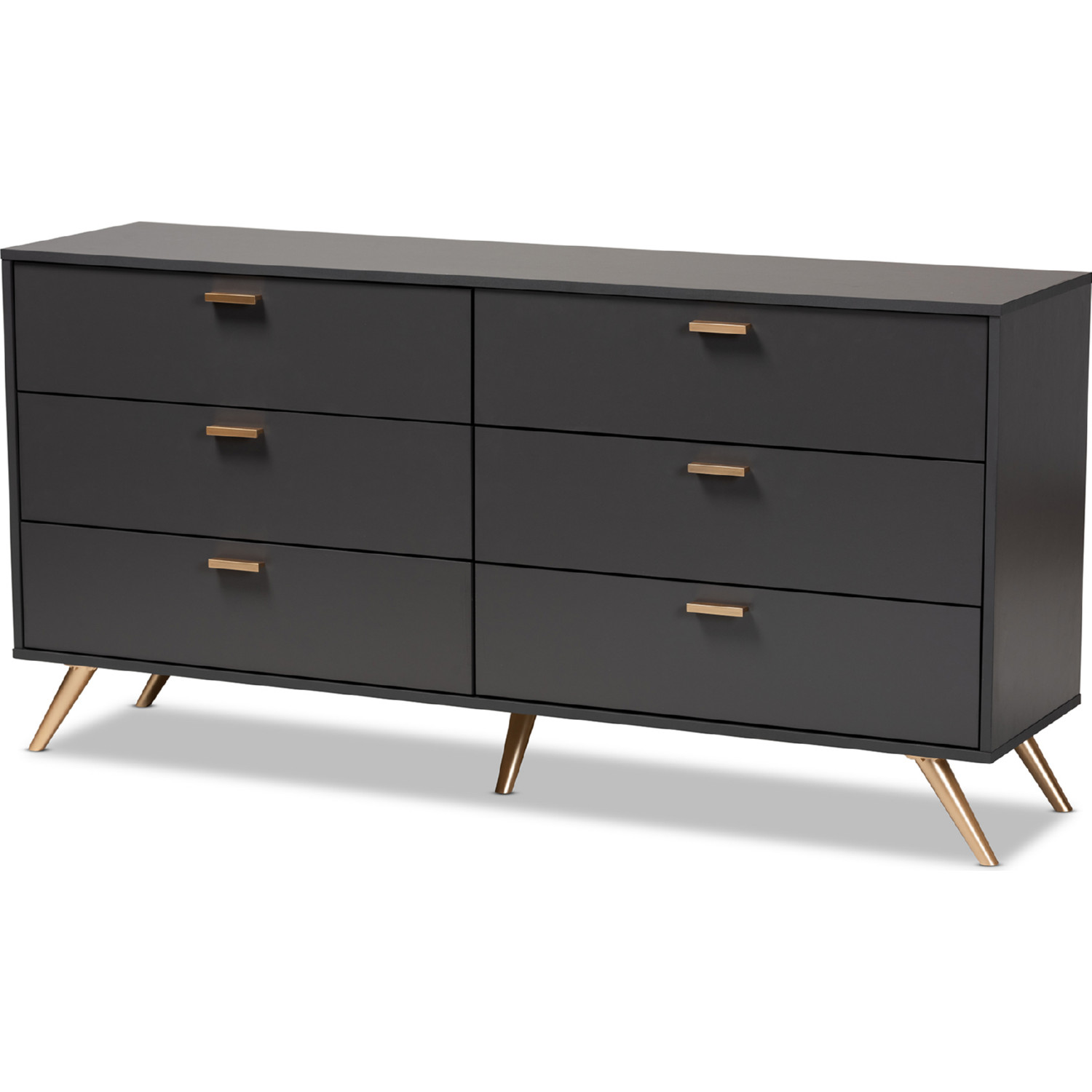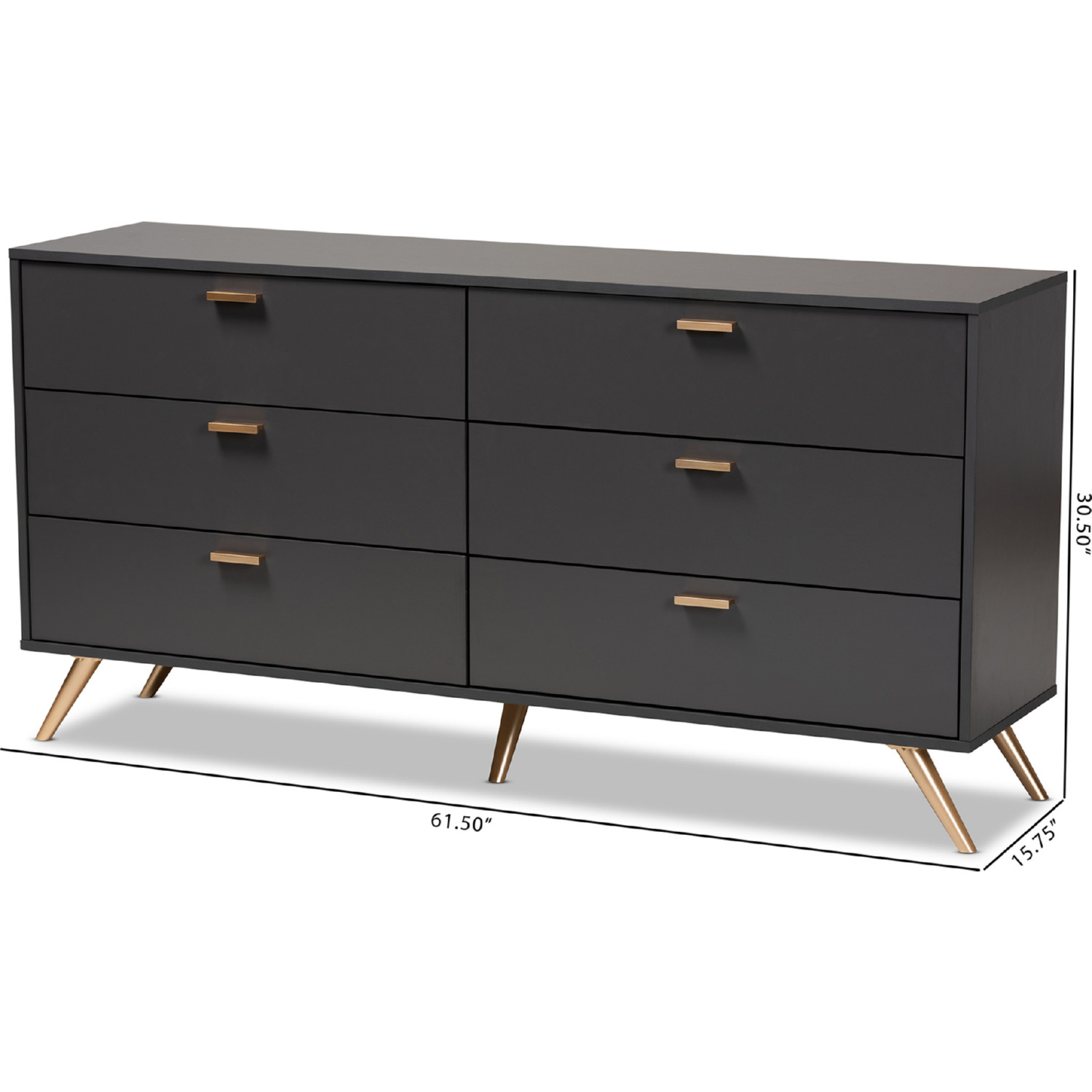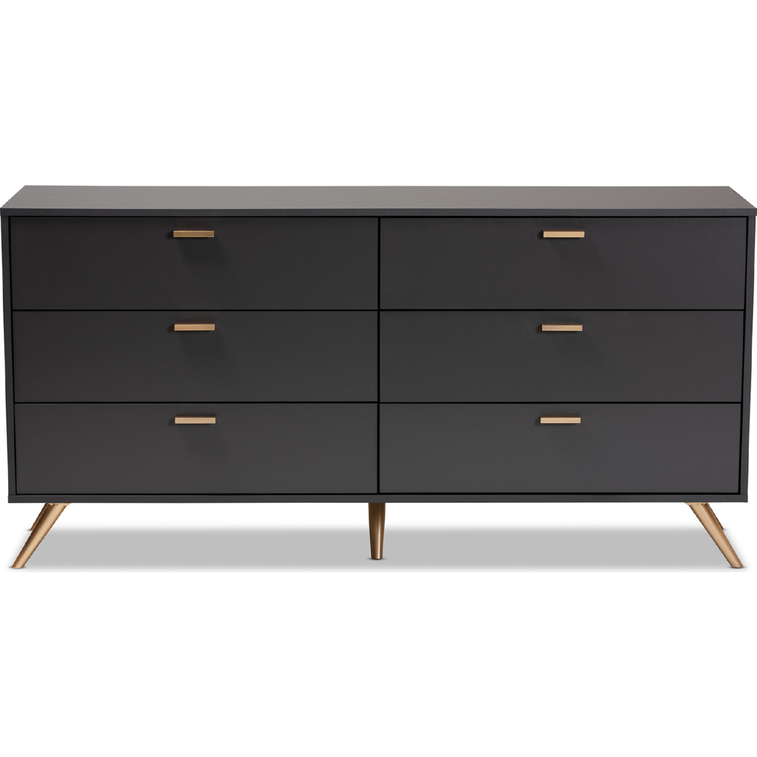 Baxton Studio Kelson 6 Drawer Dresser in Dark Gray Wood & Gold
