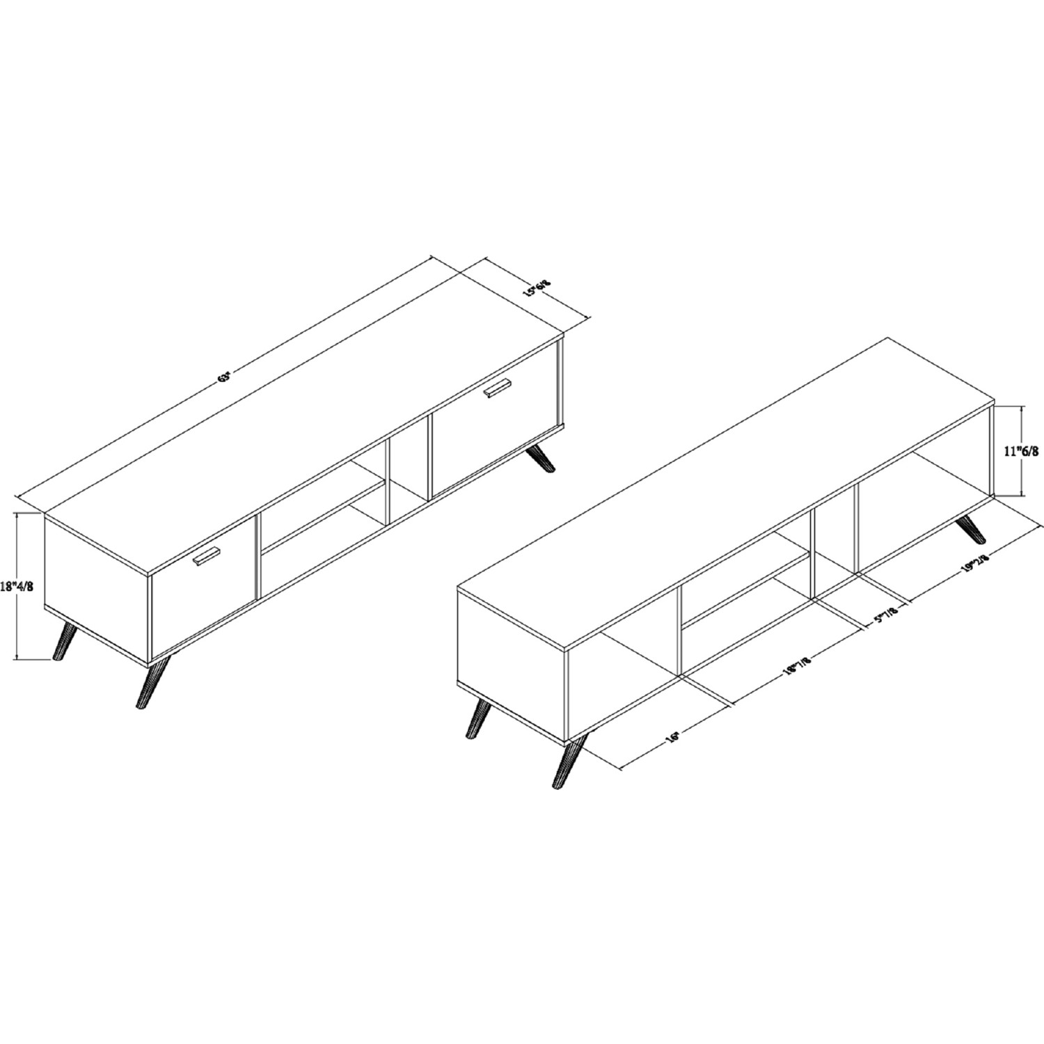 Dimensions: 63"W x 15.75"D x 18.5"H, Large Shelf: 5.4"H x 18.9"W x 14.8"D, Small Shelf: 11.3"H x 5.9"W x 14.8"D, Storage Behind Left Door: 11.75"H x 16"W x 14.1"D, Storage Behind Right Door: 11.75"H x 19.25"W x 14.1"D, Legs: 6"H