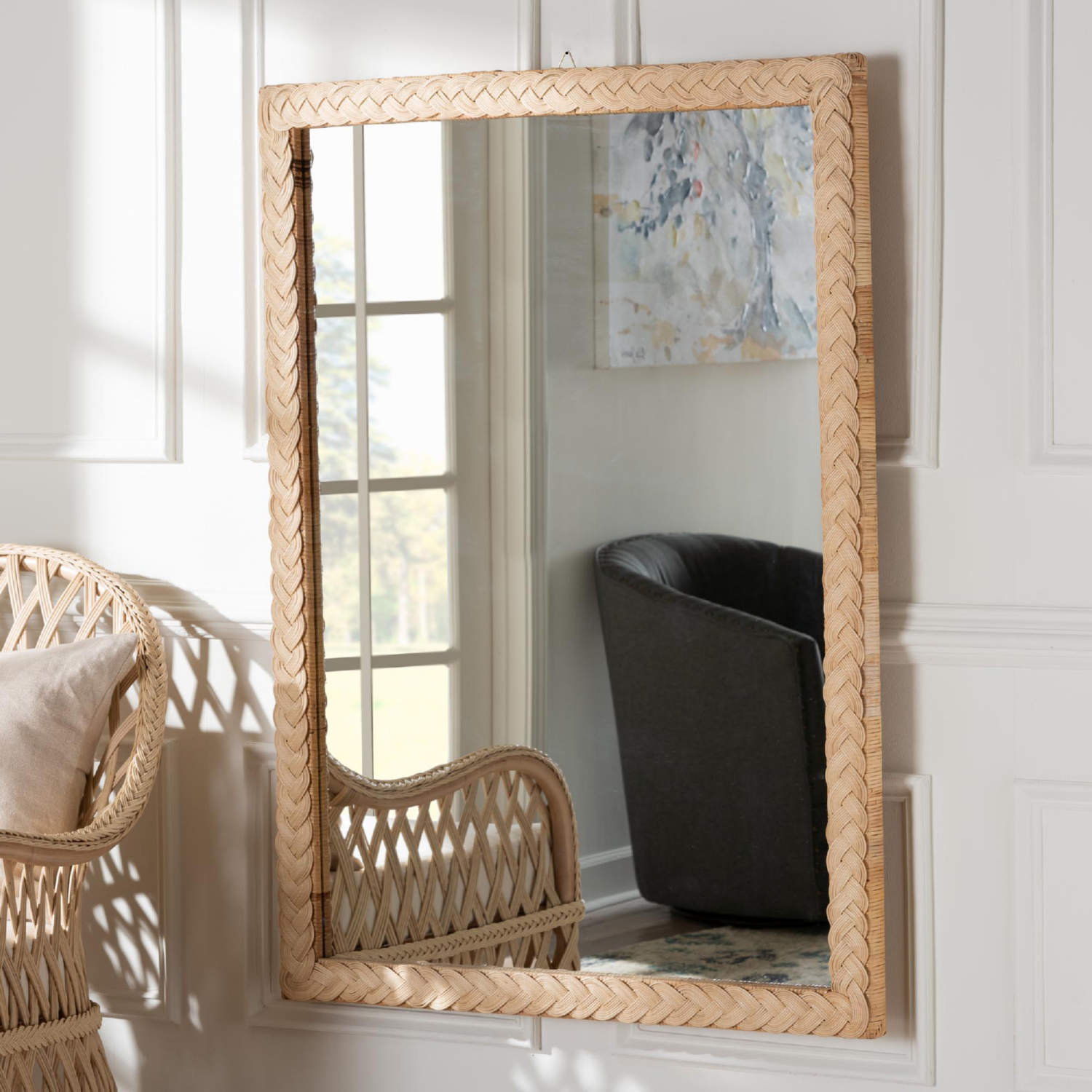 • Japandi rectangular silhouette wall mirror with braided rattan embellishments