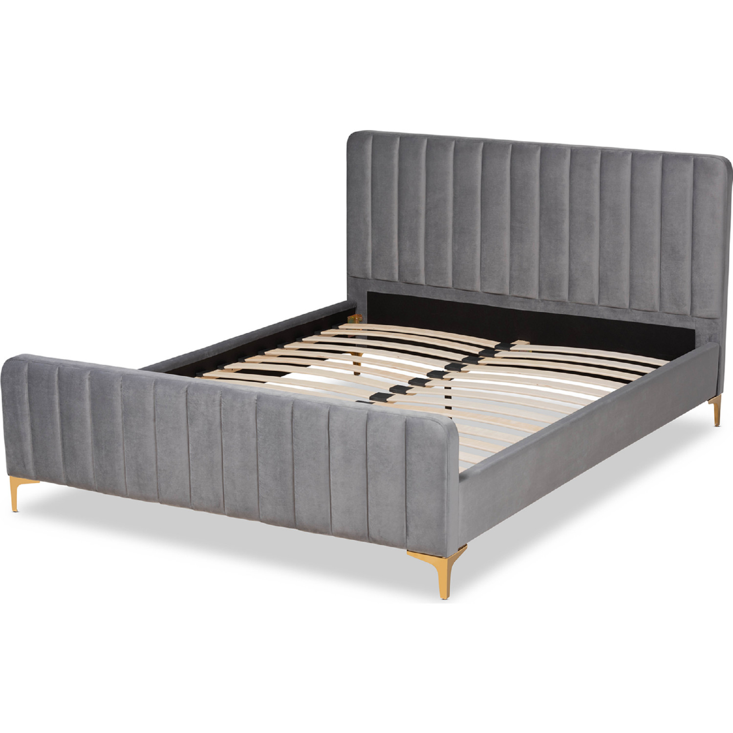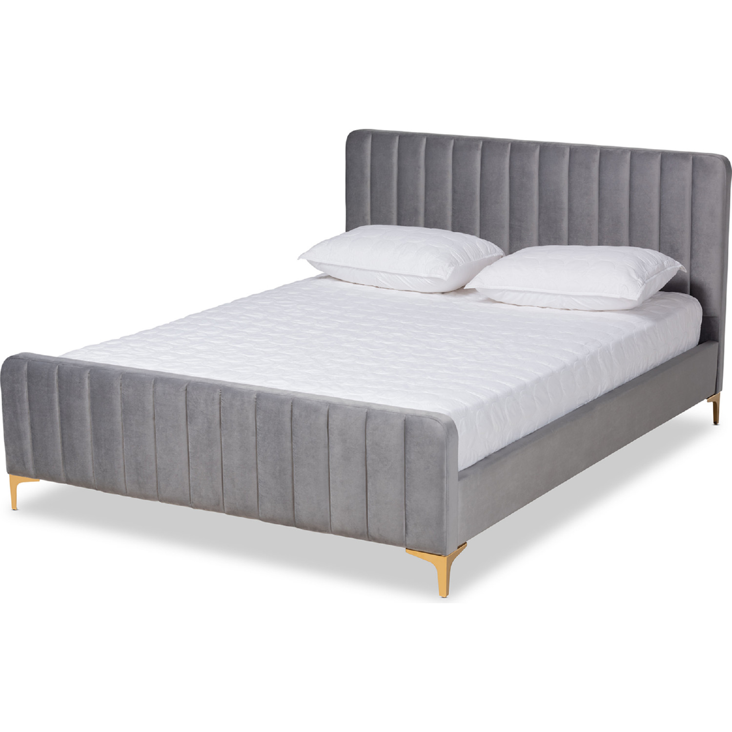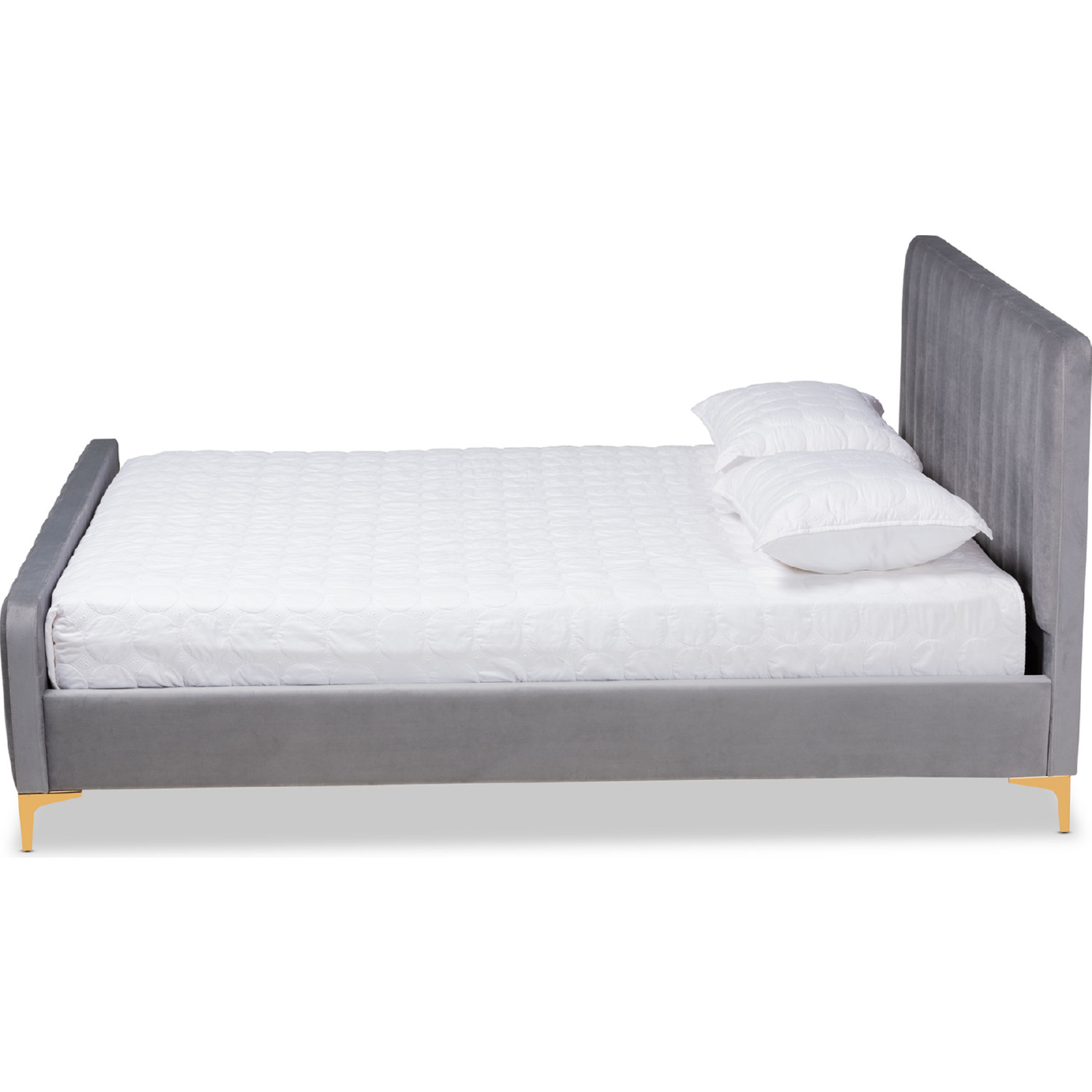 Baxton Studio Nami Queen Platform Bed in Tufted Light Gray Velvet & Gold