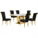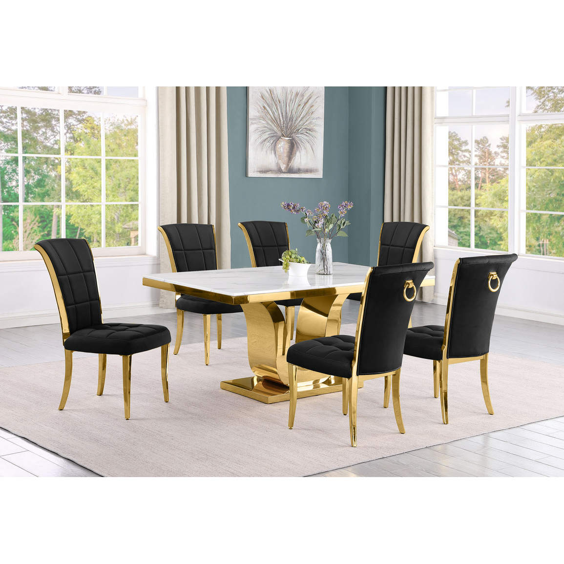 Best Quality D320 7 Piece Dining Set in White Marble, Gold Stainless Steel & Black Velvet