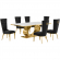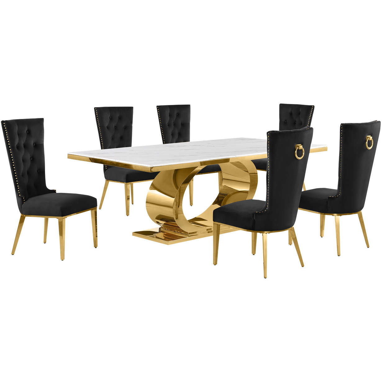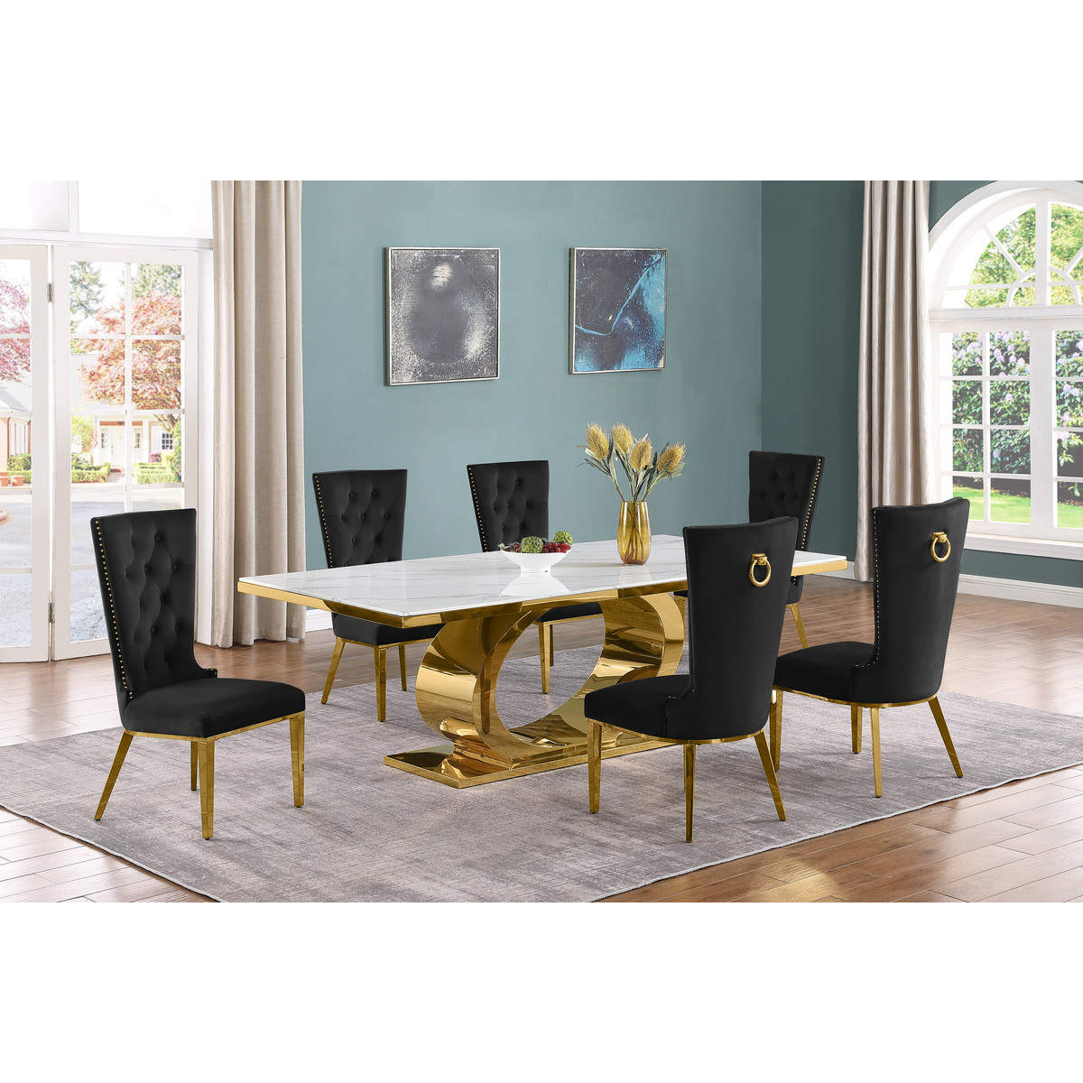 Best Quality D433 7 Piece Dining Set in White Marble, Polished Gold Stainless Steel & Black Velvet