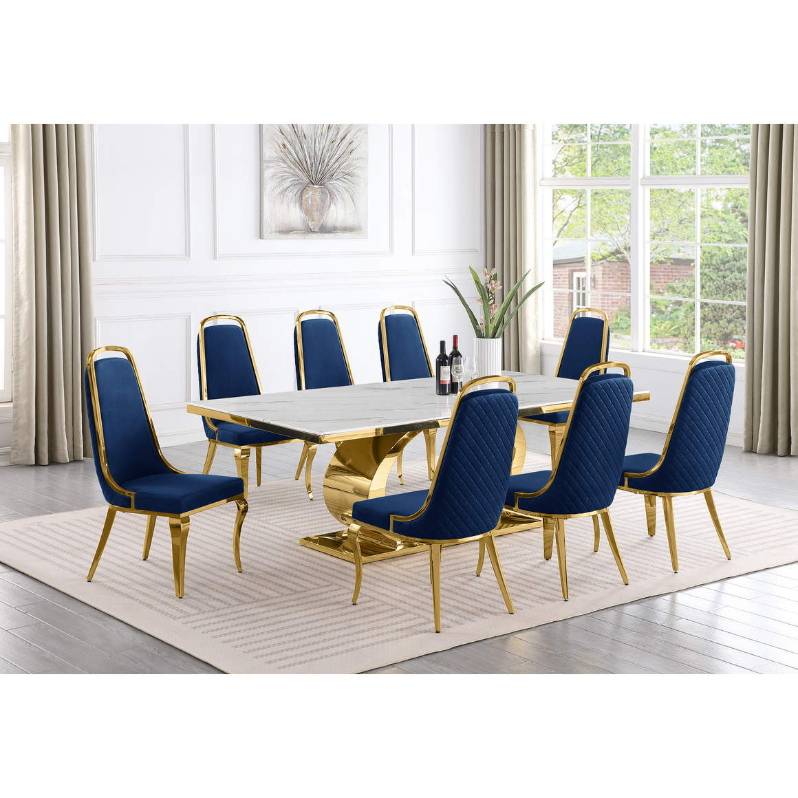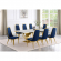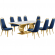 Best Quality D433 9 Piece Dining Set in White Marble, Polished Gold Stainless Steel & Navy Blue Velvet