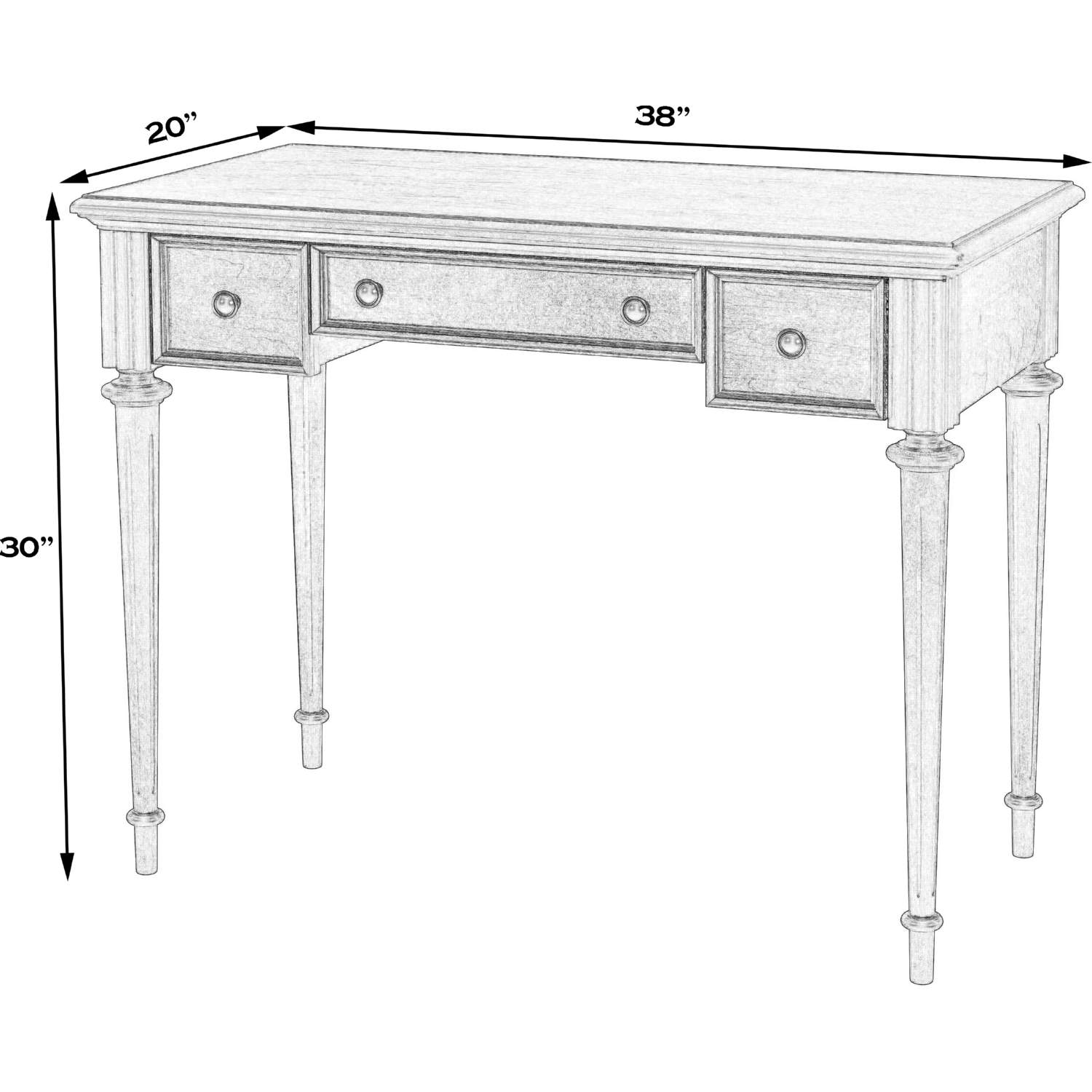 Dimensions: 38"W x 20"D x 30"H, Drawer: Middle Drawer: 17" x 14.25" x 4", Side Drawers: 7.5" x 14.25" x 3.75", Leg Height: 22.5" from floor to desk apron, Knee Space: 24.17" floor to middle drawer, 22.44" floor to side drawers, Width between legs: 33.15"W x 15.15"D