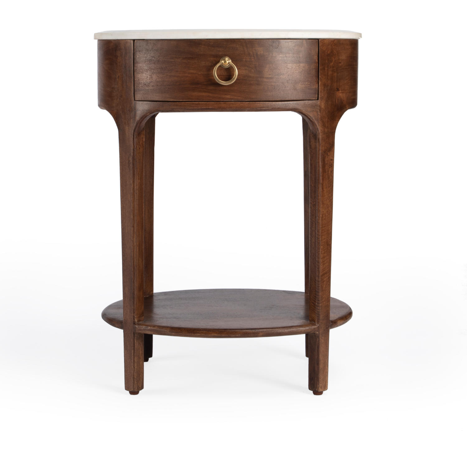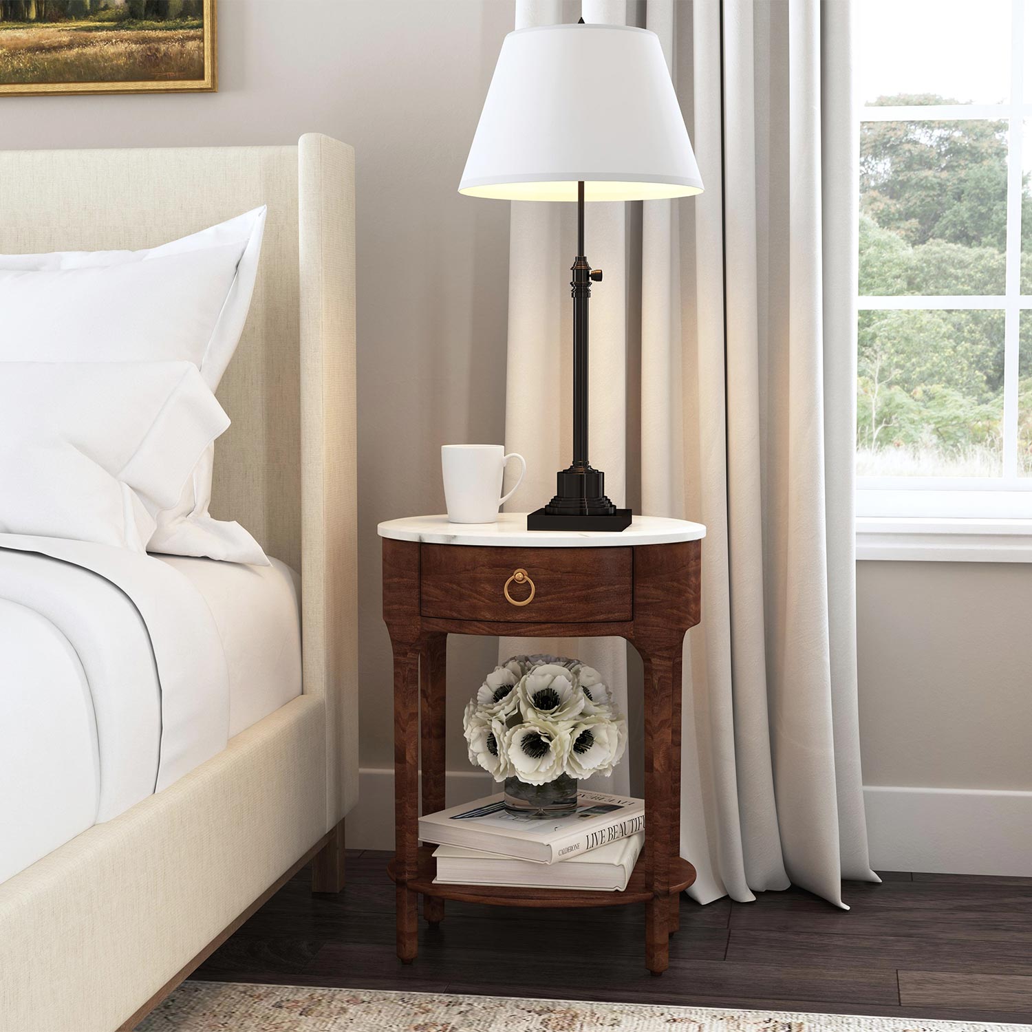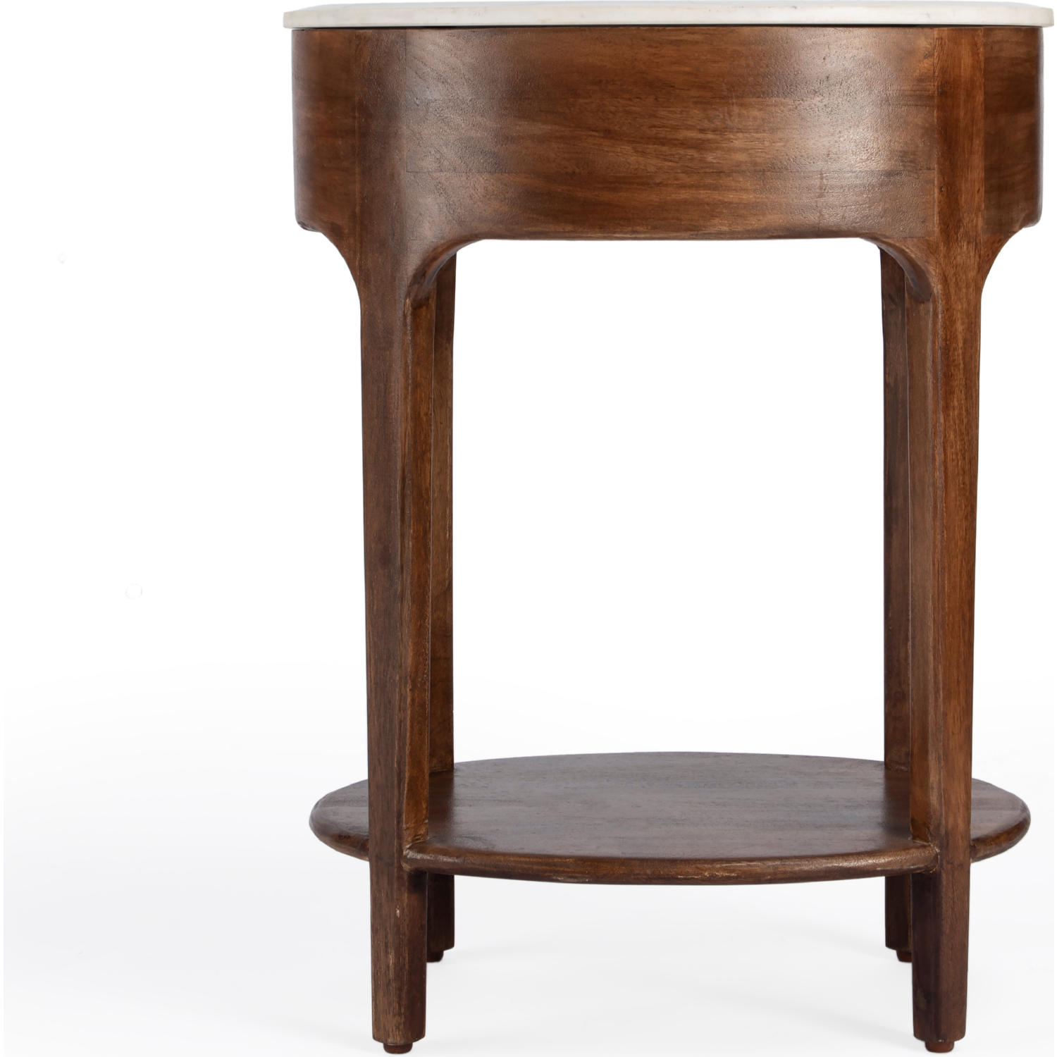 Inspired by mid century design, this oval shaped and slender design on the Ellen one drawer nightstand make this the perfect addition to your home. The gorgeous white marble top adds just the right touch of contrast and variation with the gray marbling. There is one lower shelf for added storage making this piece great as both your beside table or and end table. Marble is a natural stone product and is known for its variation in color, carbon deposits and veining patterns. Variations in shade and markings are normal and can be expected with the natural materials used in the construction of this product. Due to the porous nature of marble, it is vulnerable to staining agents and high heat. Avoid placing hot or wet items on surface. Coasters recommended