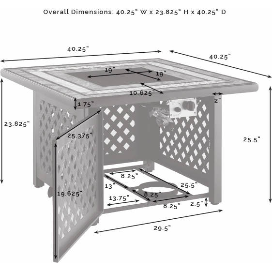 Dimensions: Fire Table: 41.88"W x 41.88"D x 25.13"H, Swivel Rocker: 29.33"W x 28.25"D x 26"H, Floor Clearance: 4.25", Back Height: 16.5", Seat Height: 21.75", Seat Depth: 25"
