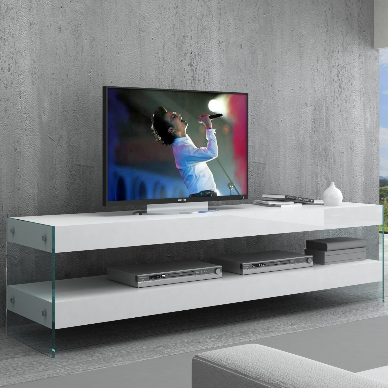 J and M Furniture Cloud 72" TV Stand in High Gloss White & Tempered Glass