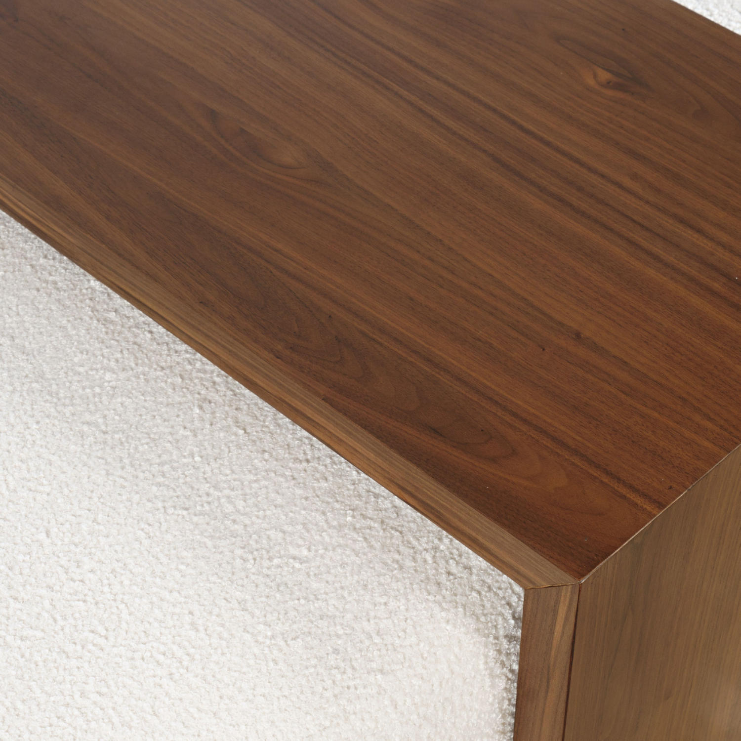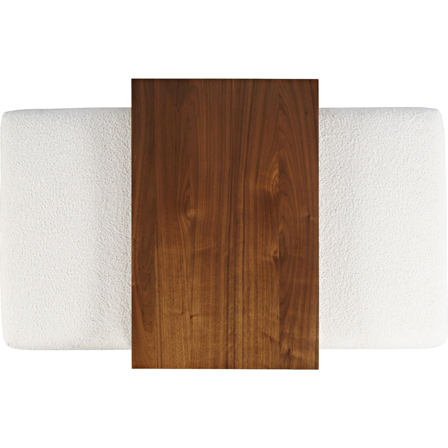 • Crafted with plush ivory boucle fabric and a sleek wood base