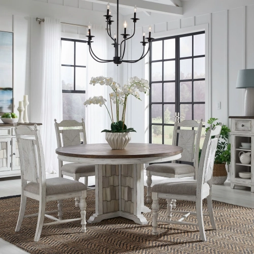 Liberty Furniture River Place 5 Piece Pedestal Dining Set in Distressed White & Brown Wood