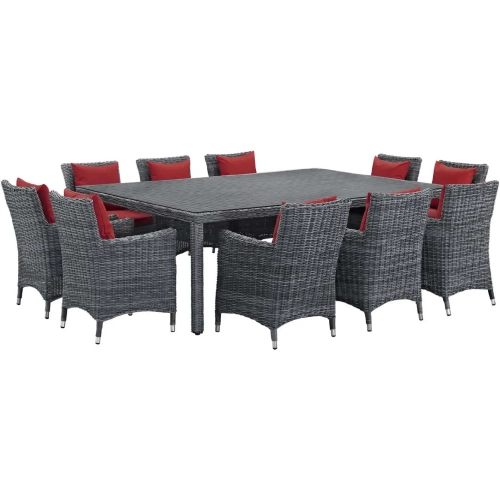 Modway Summon 11 Piece Outdoor Sunbrella® Dining Set in Gray Rattan & Red