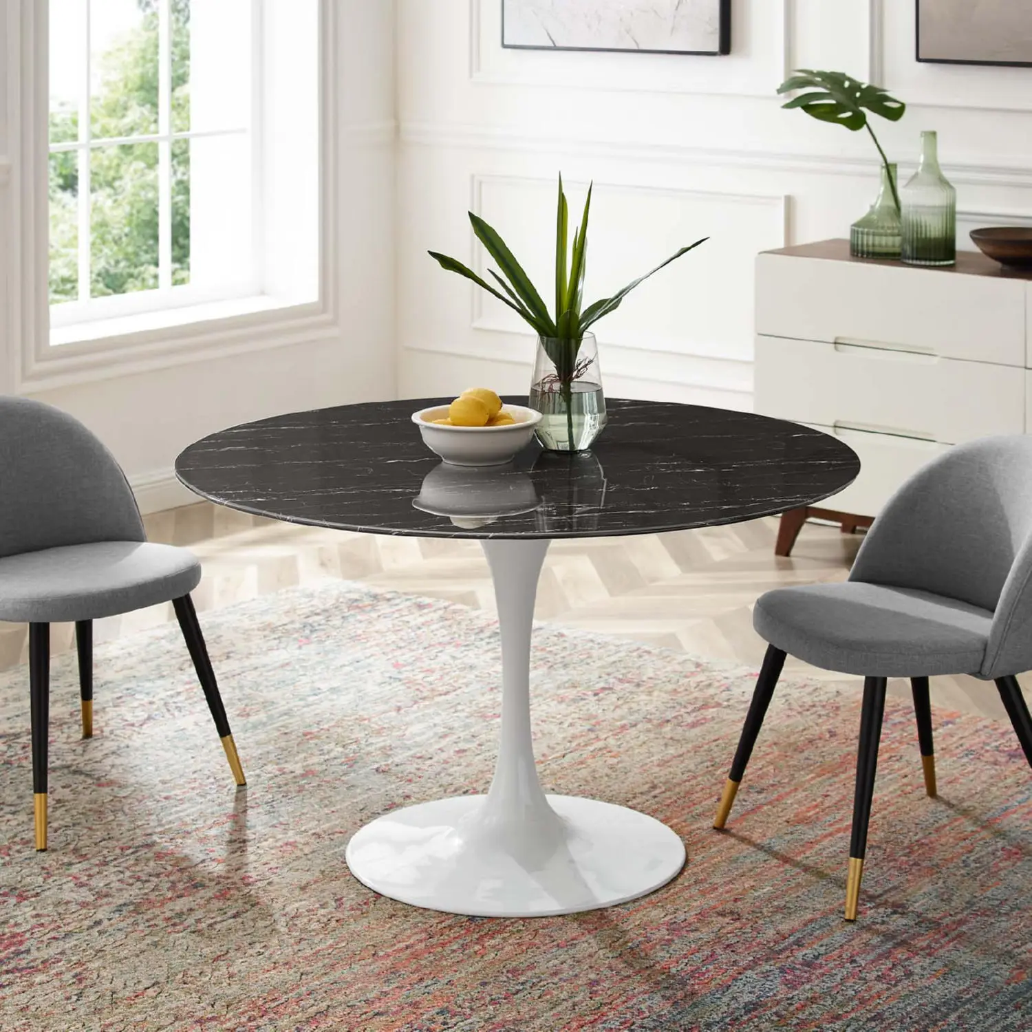 Modway Lippa 47" Dining Table in Black Faux Marble & White Metal