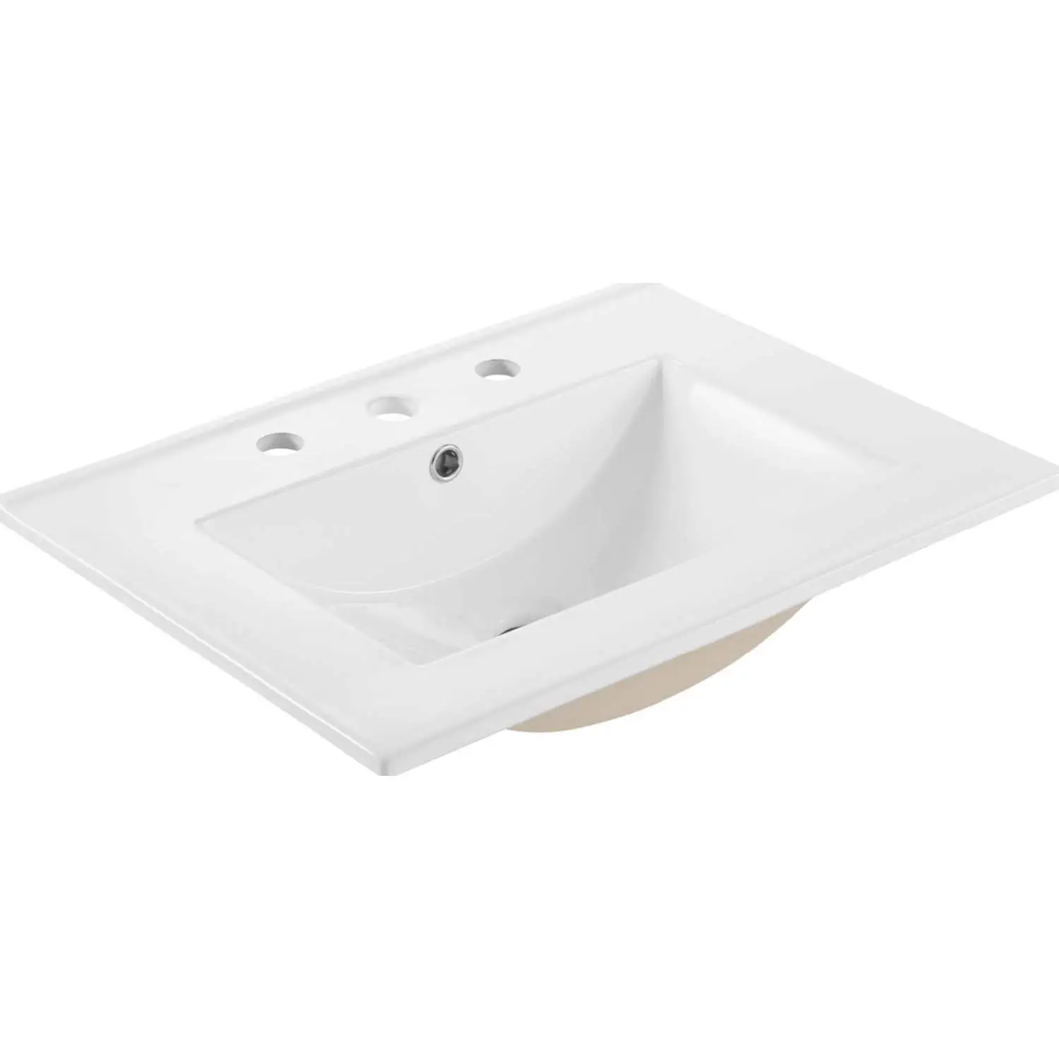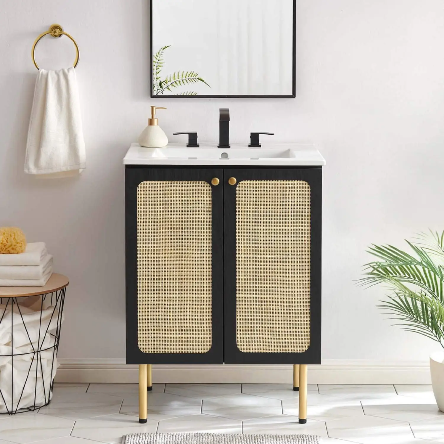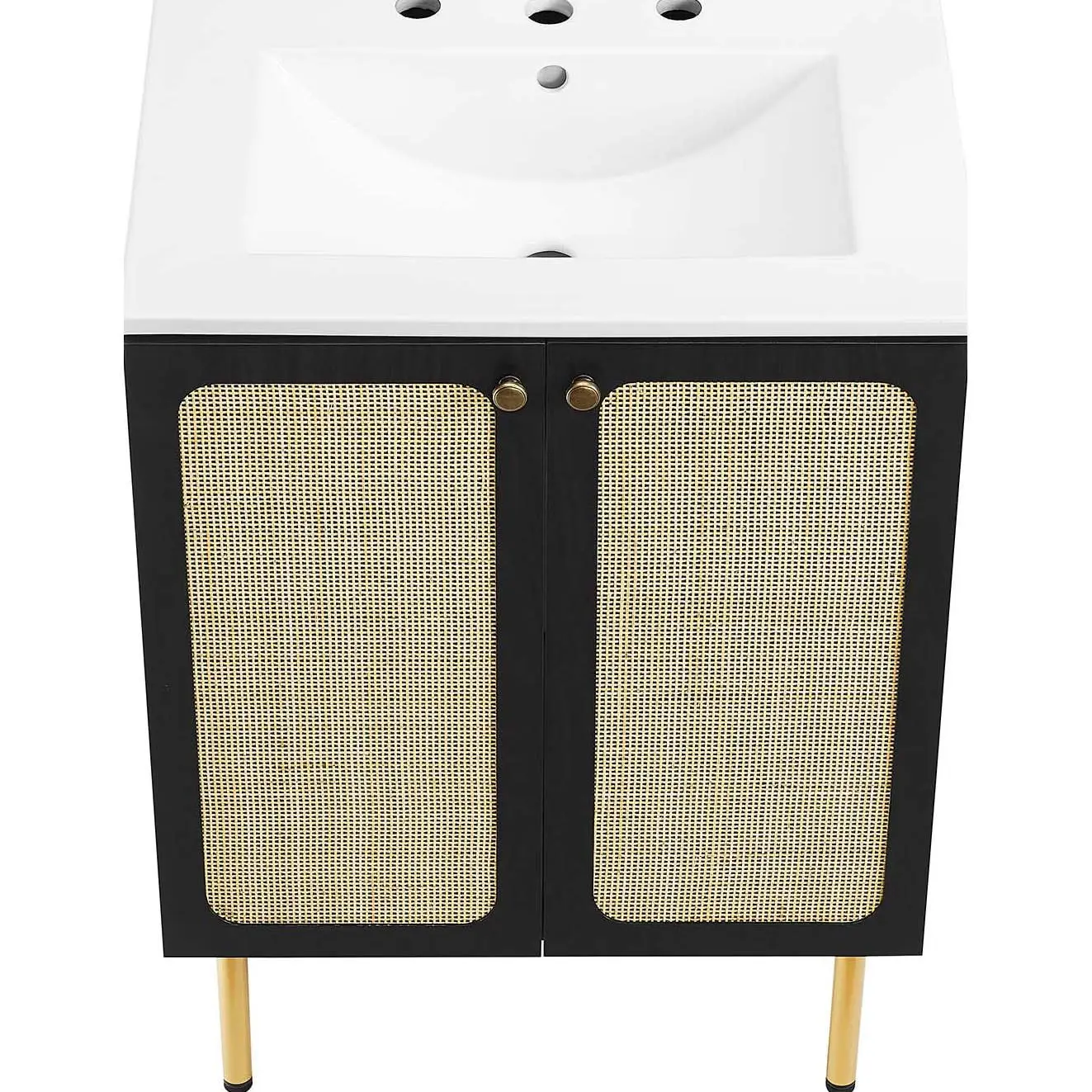 Modway Chaucer 24" Bathroom Vanity in White Ceramic, Black Wood Grain & Rattan