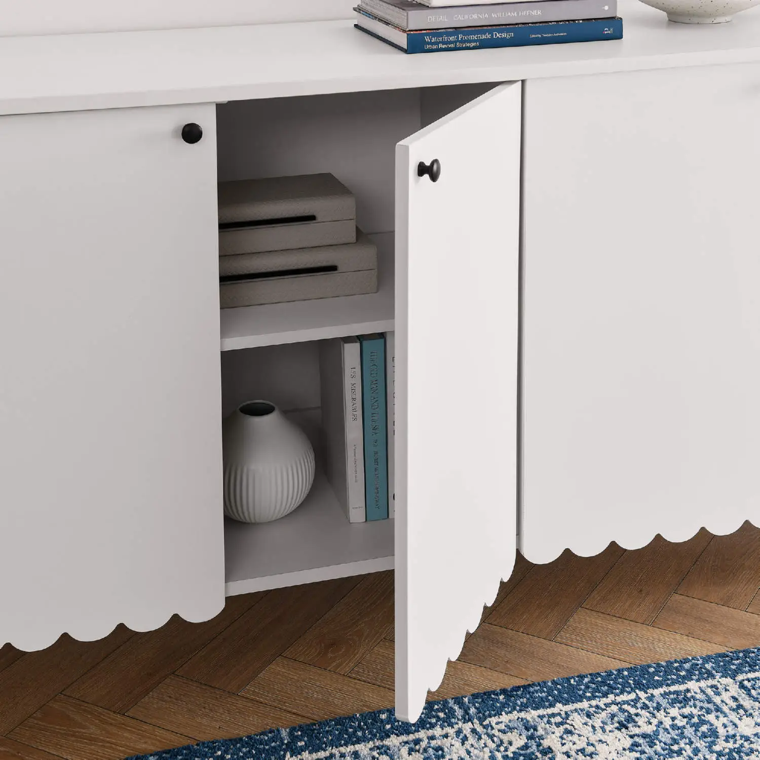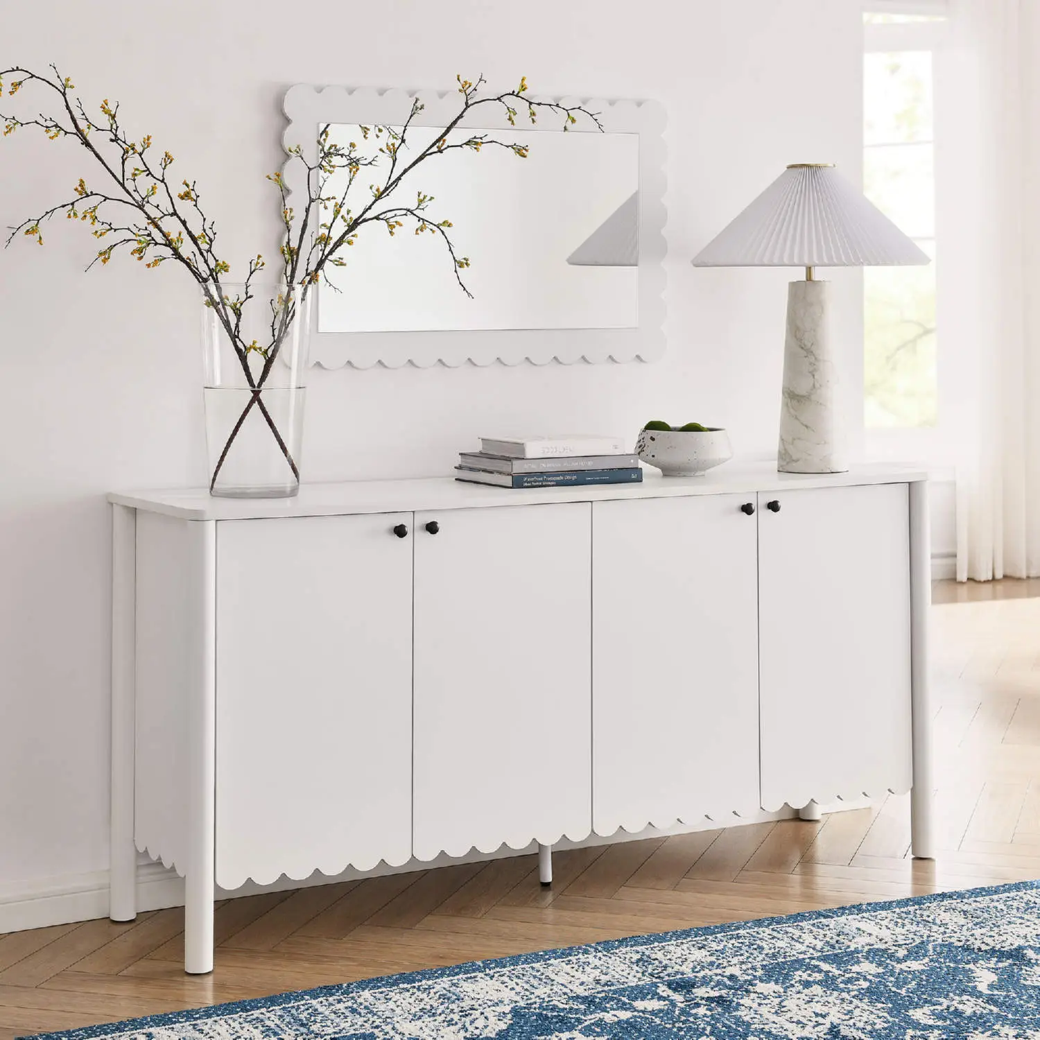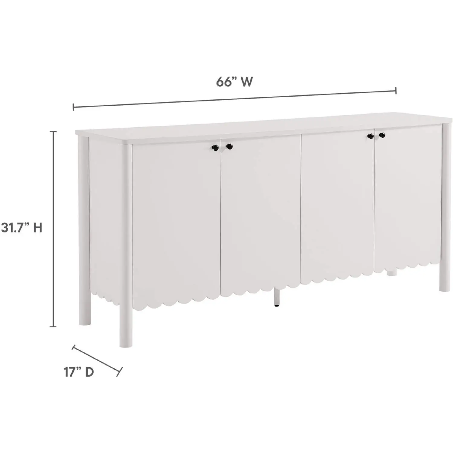 An elegant blend of subtle curves and practical storage, the Emmeline 4-Door Wavy Sideboard Cabinet adds a touch of artistic flair to any room. Its standout feature - a scalloped bottom edge - creates a soft, flowing silhouette that enhances the modern simplicity of the design. Behind its four soft close doors, adjustable shelves provide flexible storage space, ideal for organizing dining essentials, decor, or media accessories. Crafted with a sturdy frame and finished in smooth laminate, this wide farmhouse sideboard is as functional as it is stylish. The round door knobs and non-marking glides add to its refined appearance, while ensuring your floors remain protected. Whether serving as a modern sideboard, accent cabinet, or entryway console with storage, Emmeline brings a contemporary, polished look to hallways, dining rooms, or living spaces. Assembly required.