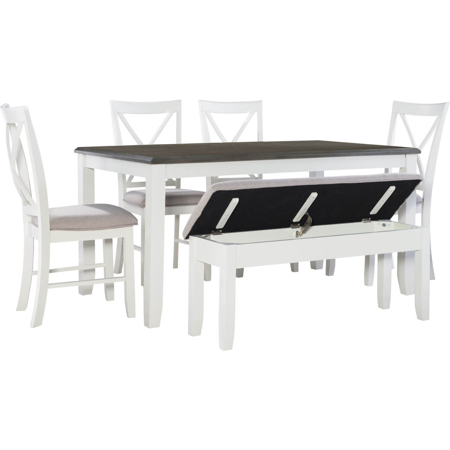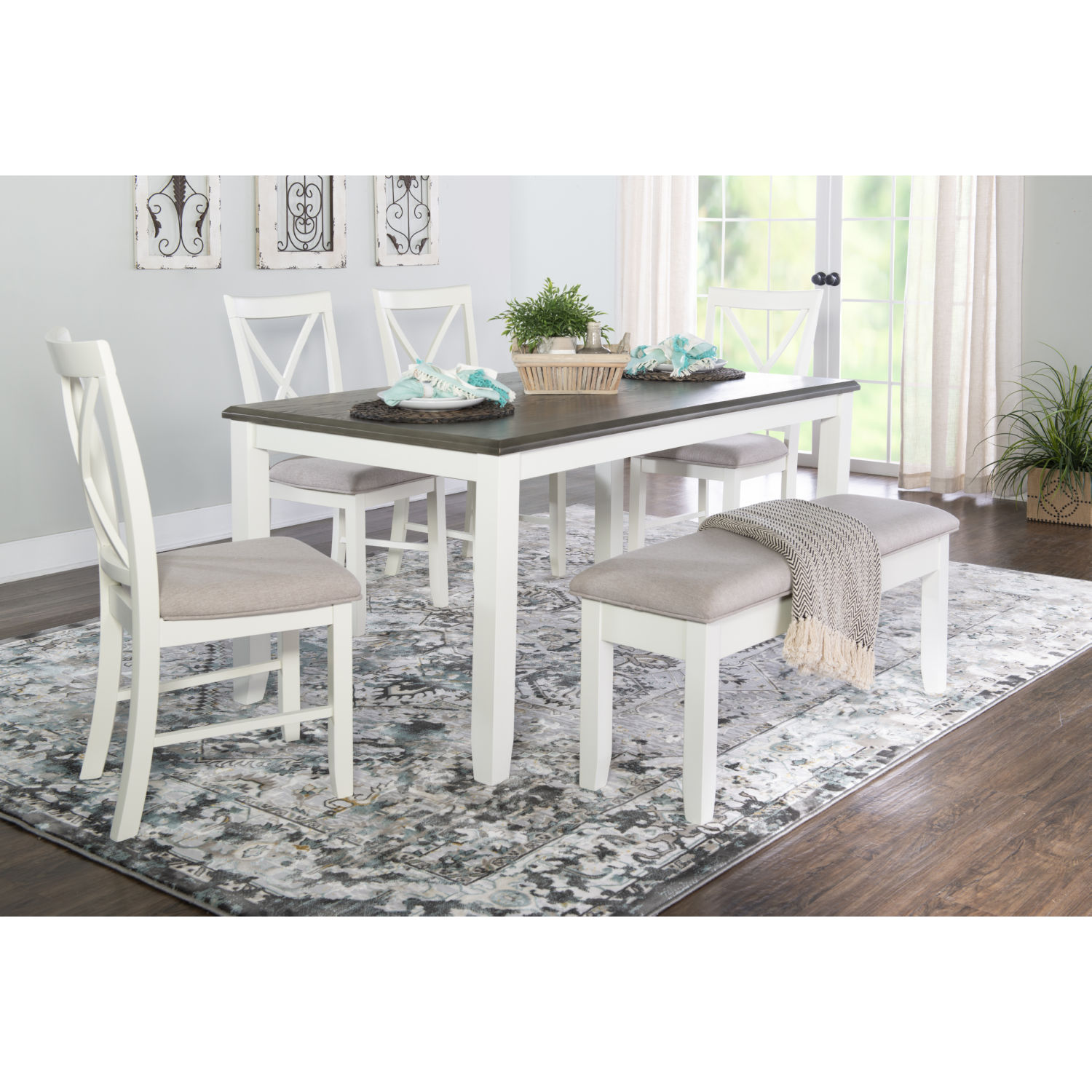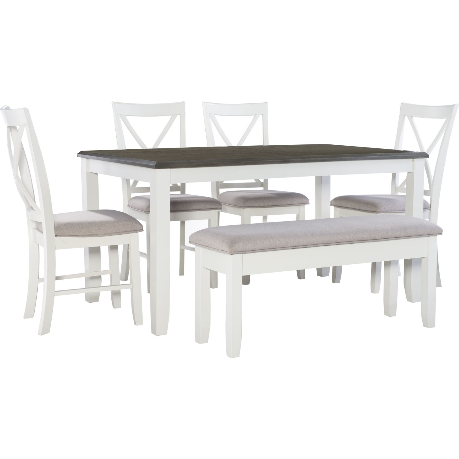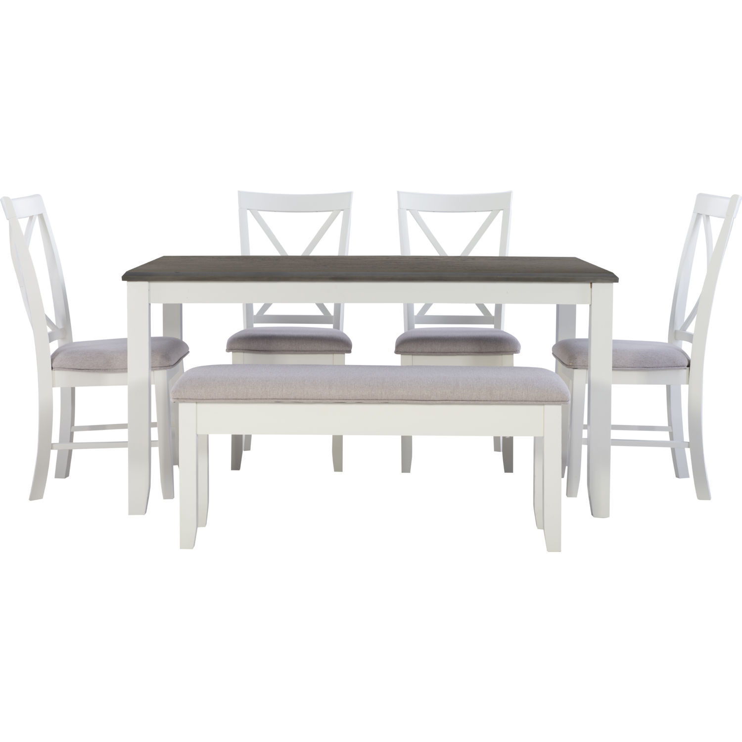 Powell Jane 6 Piece Dining Set in Vanilla White & Gray Fabric (Table, Bench, & 4 Chairs)