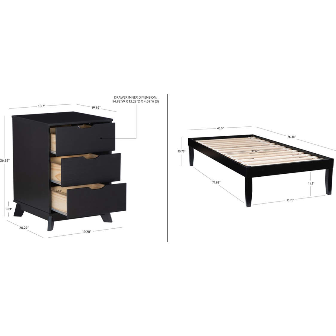 Dimensions: Twin Bed: 40.50"W x 76.37"D x 15.75"H, Leg Height: 11.50", Nightstand: 19.25"W x 20.25"D x 26.88"H, Leg Height: 3.94", Nightstand Drawers: 14.9" x 13.2"