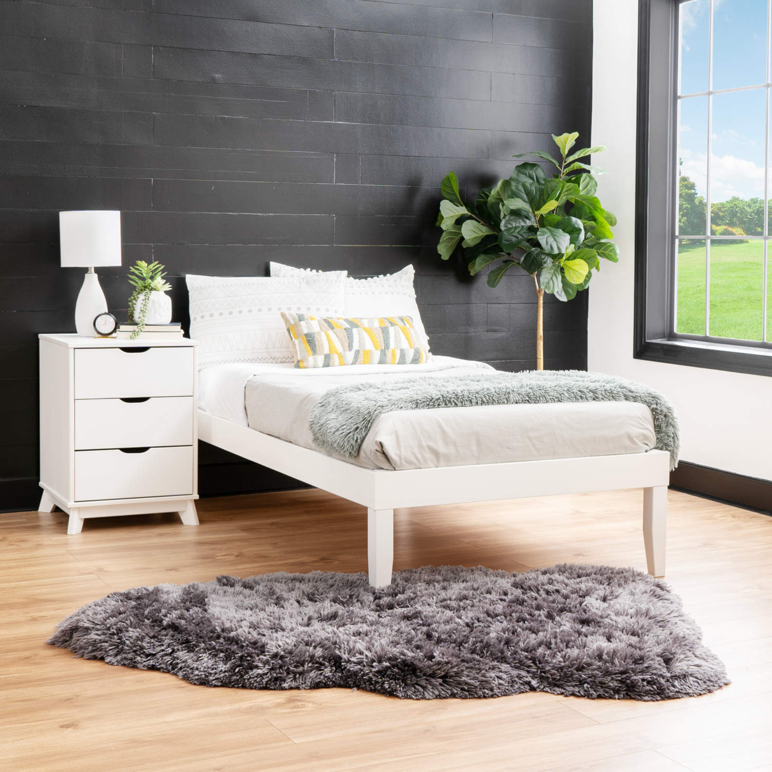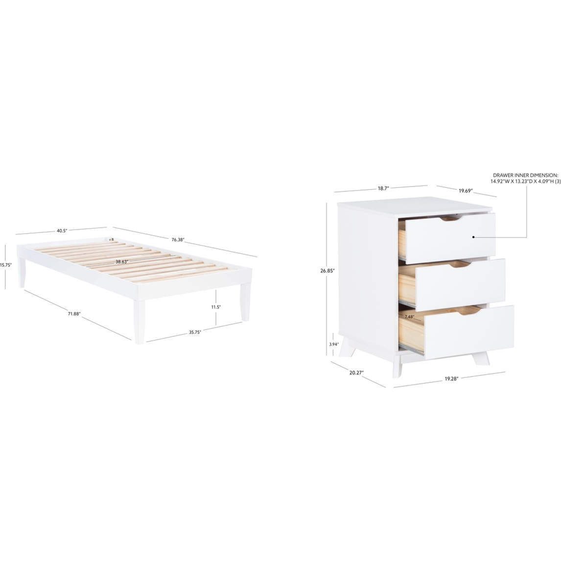 Dimensions: Twin Bed: 40.50"W x 76.37"D x 15.75"H, Leg Height: 11.50", Nightstand: 19.25"W x 20.25"D x 26.88"H, Leg Height: 3.94", Nightstand Drawers: 14.9" x 13.2"