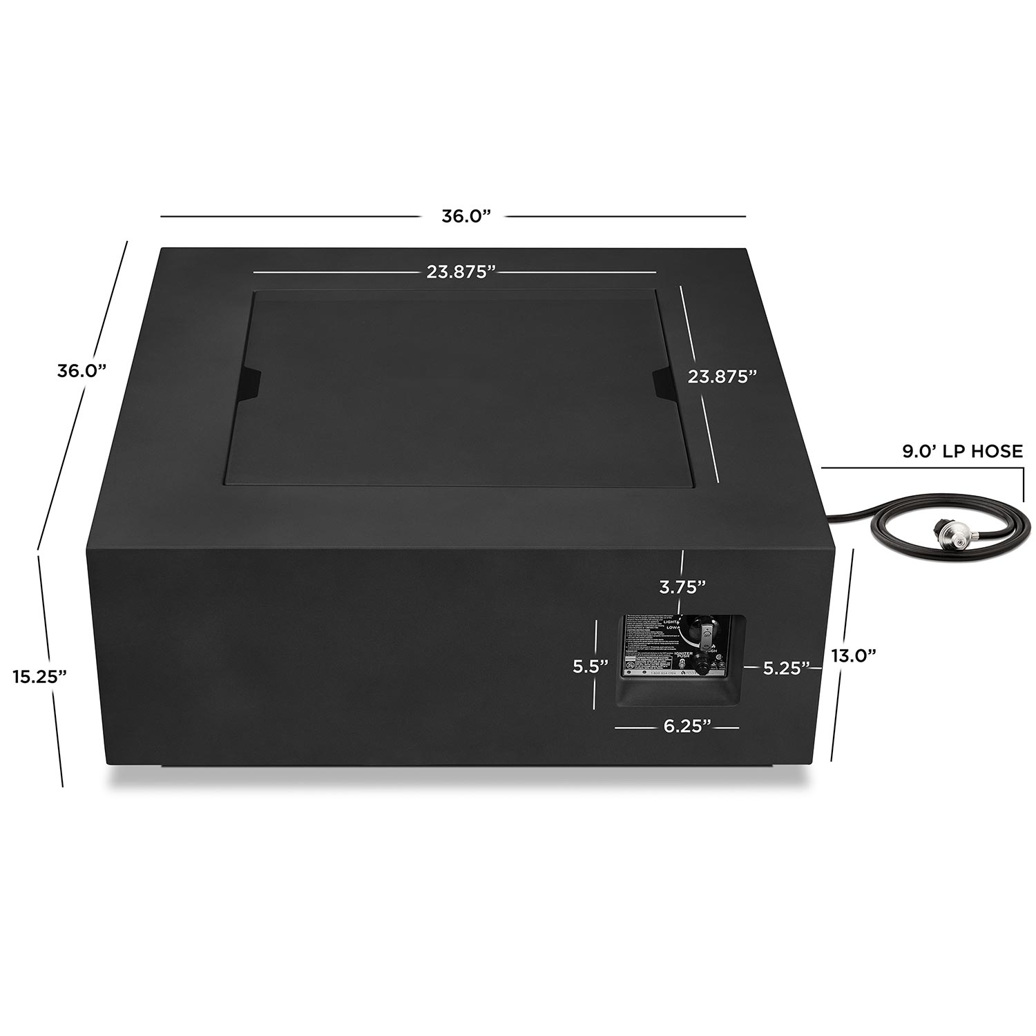 Dimensions: 36"W x 36"D x 15"H, Burn Area: 20.5" x 20.5" x 3", Round burner tube: 15" Diameter