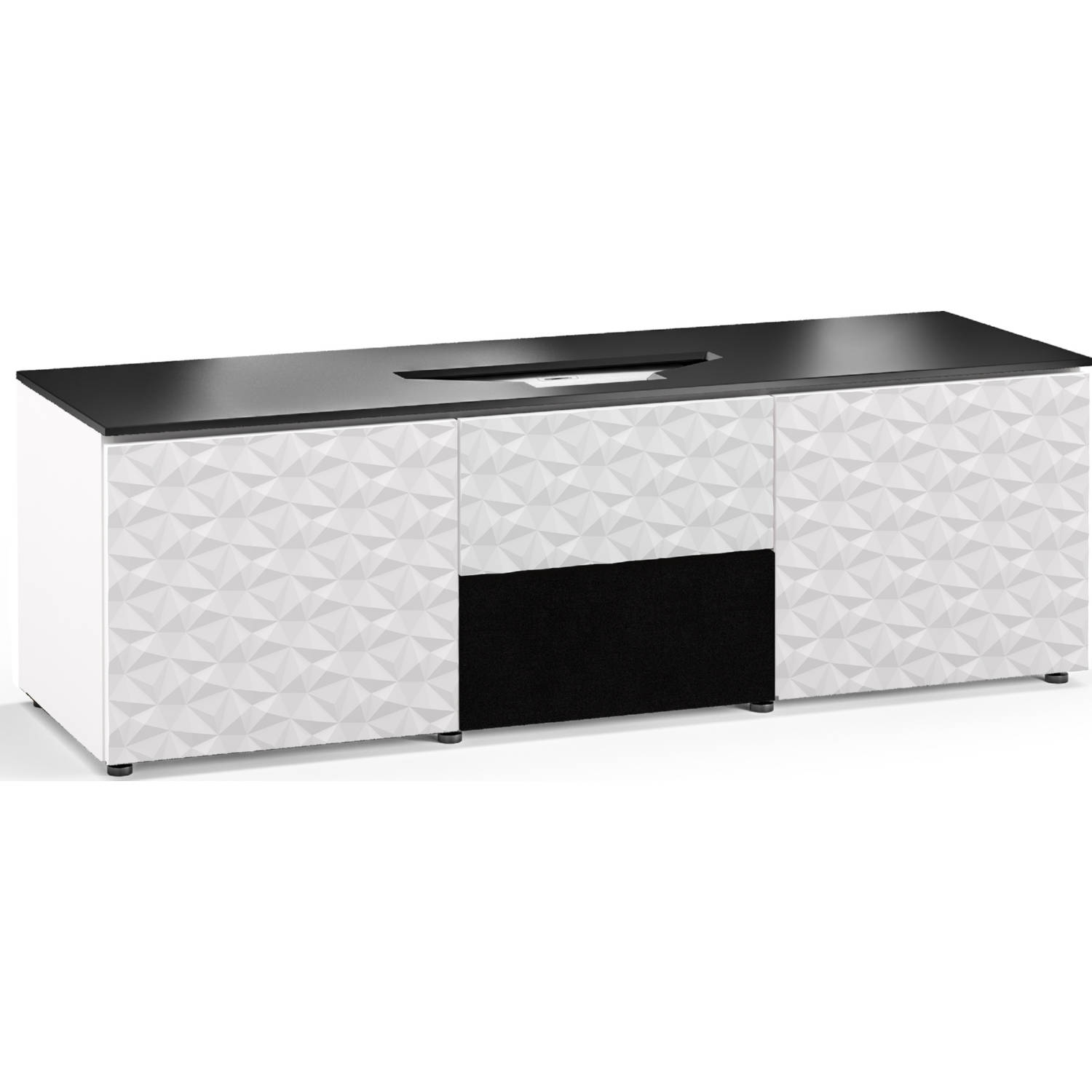 • Cabinet's center segment features an opening with a removable grille designed to hide a speaker