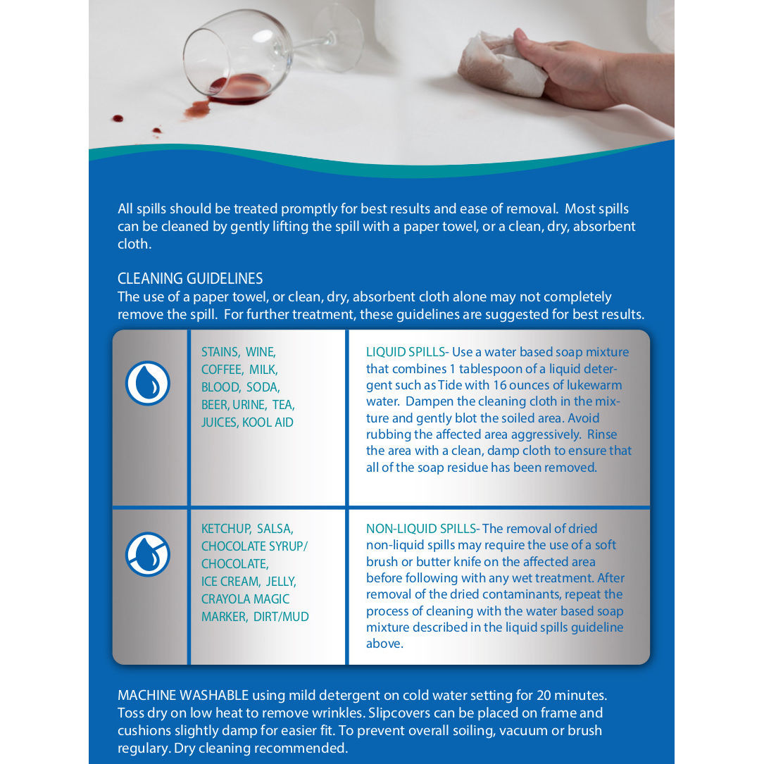 • Totally removable arm chair slipcovers with heavy duty soft dual performance fabric that combines high performance fibers and polyester yarns which are then encapsulated in a stain and water-resistant finish, spills bead up on the surface of the fabric instead of penetrating into the cushion