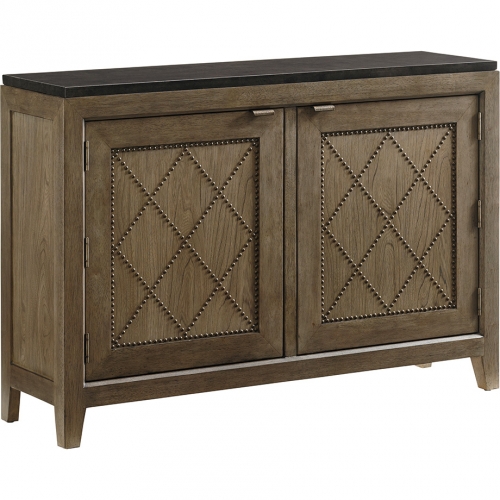 This hall chest is so versatile with its 15" depth, appealing design, and 4 adjustable shelves behind the two doors for storage or organization. The design features a stained travertine top and an elegant diamond-and-cross pattern of antique brass nailhead trim on the doors.
