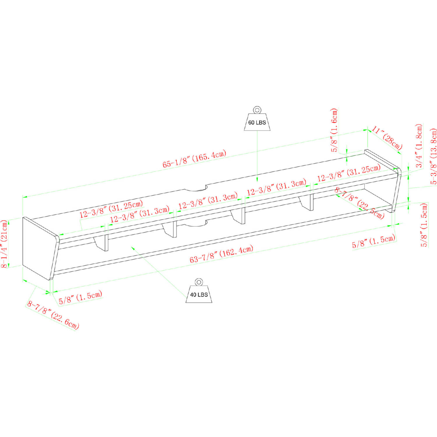 - Weight Capacity: Weight Capacity: 60 lbs, Shelf: 40 lbs