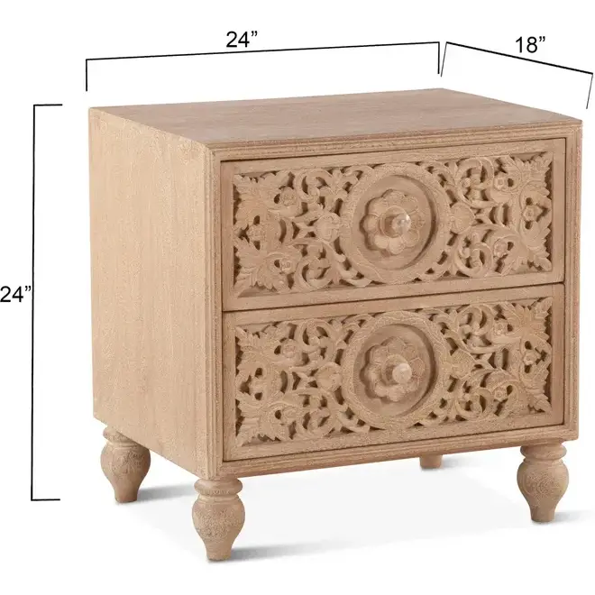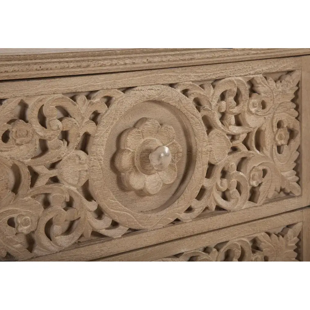 • Hand carved floral and leaf detailing across the front of each drawer