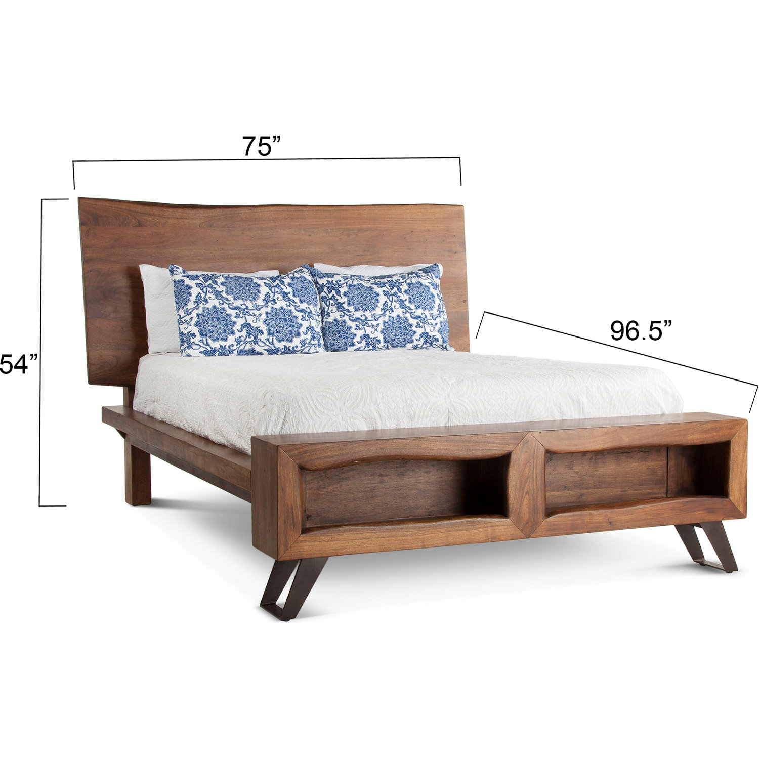 Dimensions: 75"W x 96.5"D x 54"H, Headboard: 75"W x 5.5"D x 54"H, Footboard: 69"W x 10"D x 22"H, Bed Frame - Slats to Top of Side Rail: 37", Siderail Height: 11", Distance Between Legs: 63", 2 Shelves: 8"W x 33.25"D