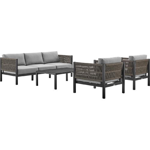 Armen Living Cuffay 4 Piece Outdoor Sofa Set in Black Aluminum, Rope & Grey Fabric