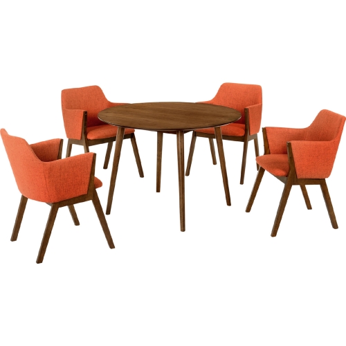 Armen Living Arcadia & Renzo 42" Round 5 Piece Dining Set in Orange Fabric & Walnut Wood