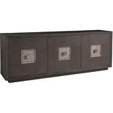 Bleached olive ash burl, white oak veneers and select hardwoods. The media credenza includes two doors, four adjustable shelves, ventilated back, and wire management.