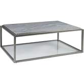 The Blue Forest Marble top features bold figuring and a range of color, pairing beautifully with the simple transitional iron base frame with a stepped apron made of dimensional stock finished in an antiqued silver leaf with a glass bottom.