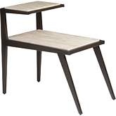 Steel base with tapered legs in a ribbed silver leaf finish with a White Vein travertine top and an inset beveled tempered glass shelf.