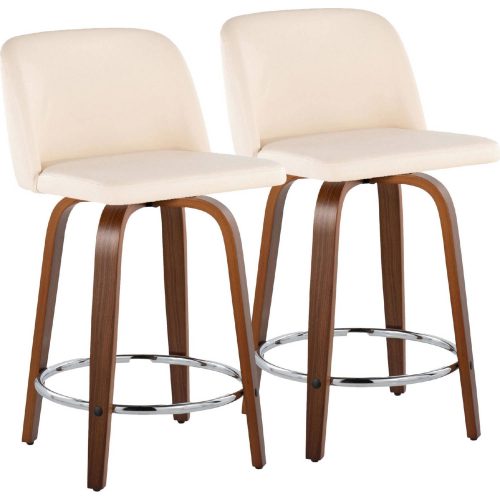 Lumisource B24-TRNOPU-GRTZR2 WLCR2 Toriano 24" Swivel Counter Stool Walnut Wood Cream Leatherette Chrome Footrest (Set of 2)