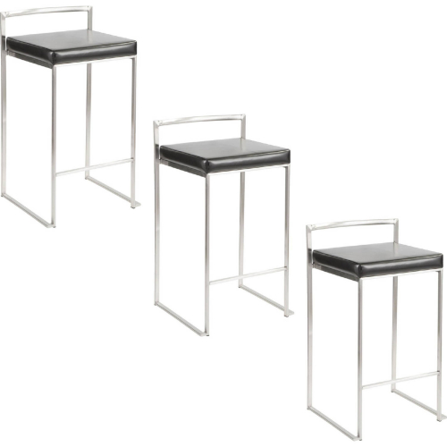 Lumisource B26-FUJIPU SSBK3 Fuji 26" Stackable Counter Stool Brushed Stainless Steel Black Leatherette (Set of 3)