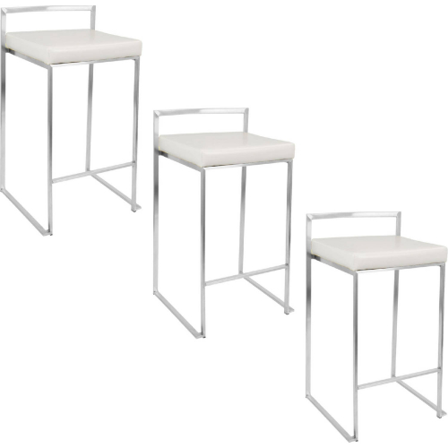 Lumisource Fuji 26" Stackable Counter Stool in Brushed Stainless Steel & White Leatherette (Set of 3)