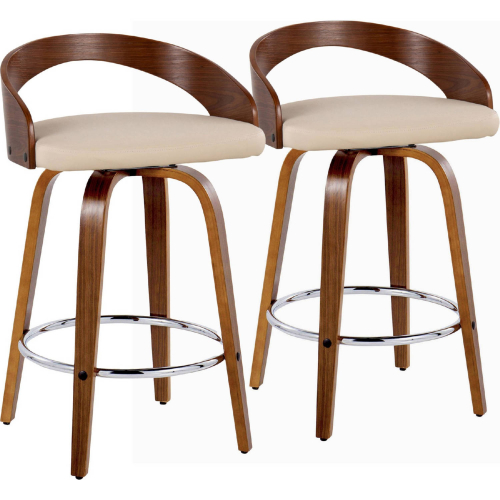 Lumisource B26-GROTTOPU-GRTZR2 WLWLCR2 Grotto 26" Swivel Counter Stool Walnut Wood Cream Leatherette Chrome Footrest (Set of 2)