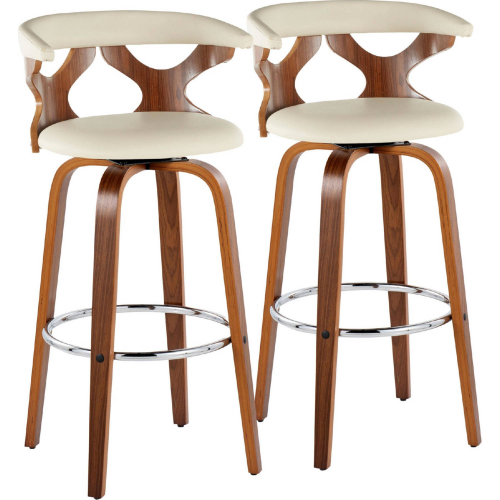 Lumisource Gardenia 30" Swivel Bar Stool in Walnut Wood & Cream Leatherette with Chrome Footrest (Set of 2)