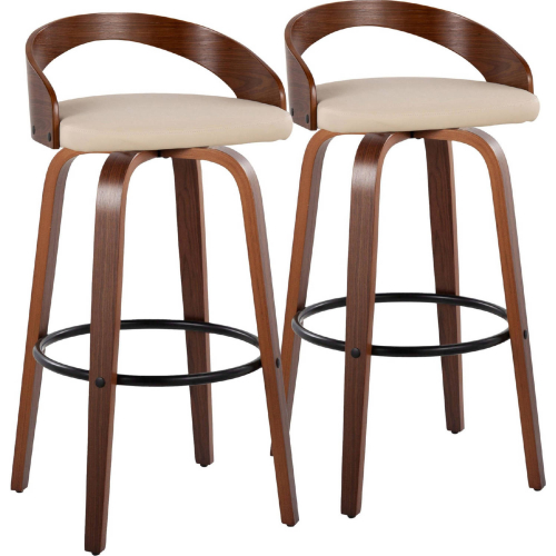 Lumisource B30-GROTTOPU-GRTZQ2 WLWLCR2 Grotto 30" Swivel Bar Stool Walnut Wood Cream Leatherette Black Footrest (Set of 2)