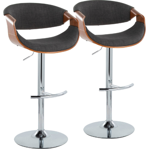 Lumisource BS-CURVO-RT2 CHRWLCHAR2 Curvo Adjustable Swivel Bar Stool Chrome Walnut Wood Charcoal Fabric (Set of 2)