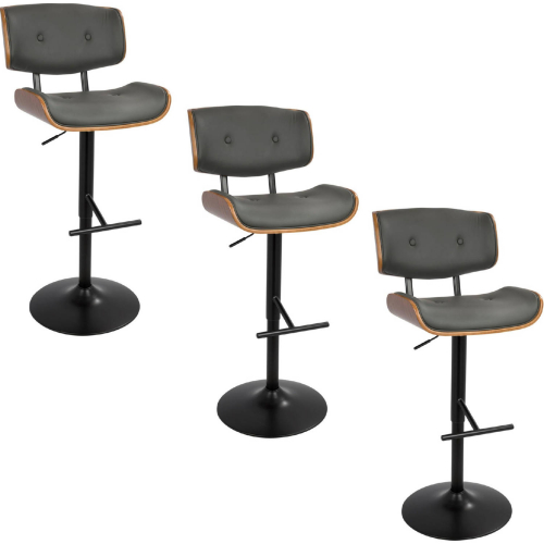 Lumisource BS-LMBPU-ST3 BKWLGY3 Lombardi Adjustable Swivel Bar Stool Black Metal Walnut Wood Grey Leatherette (Set of 3)